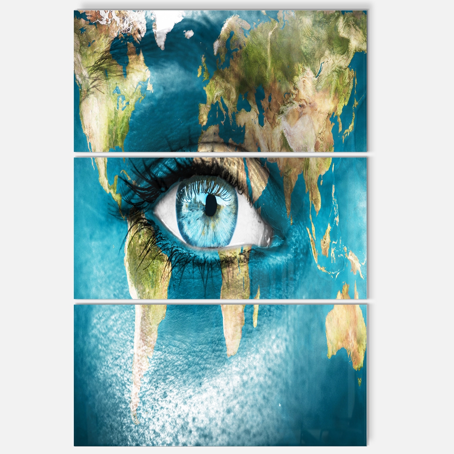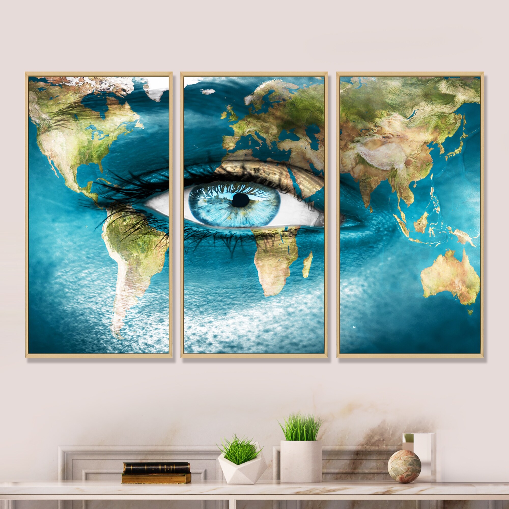 Designart "Planet Earth and Blue Eye" Abstract Framed Wall Art Set of 3 - 4 Colors of Frames