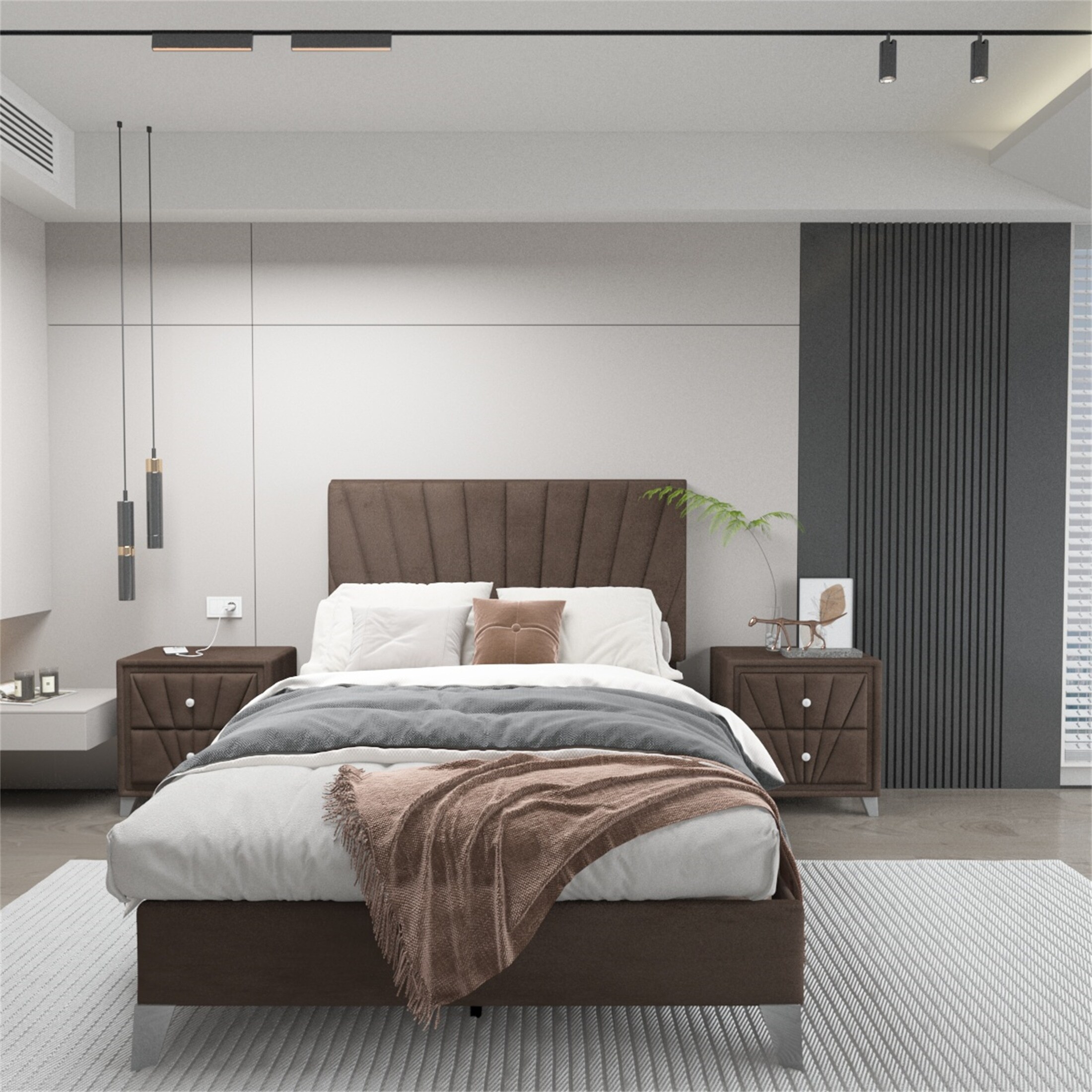 Queen Bed with One Nightstand Beautiful Line Stripe Cushion Headboard