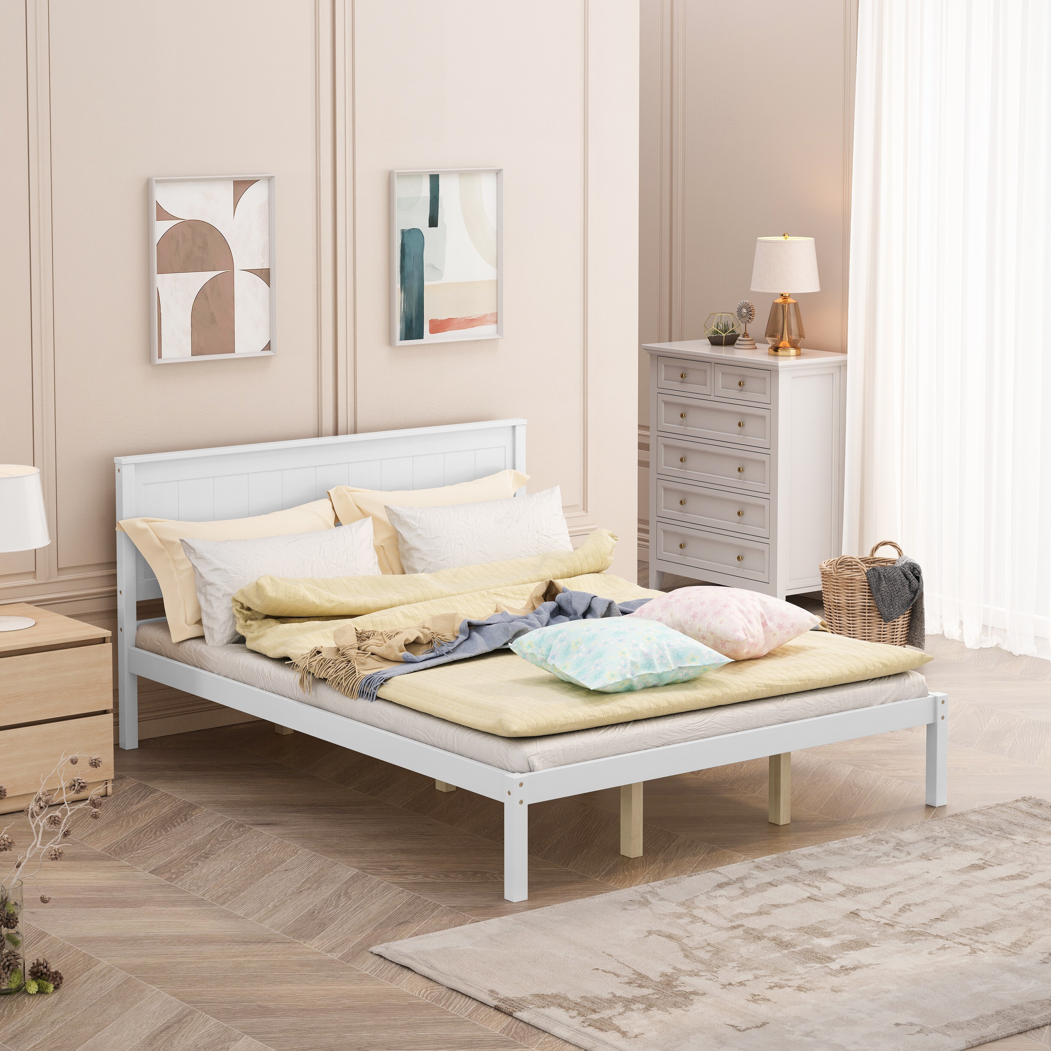 Wooden Queen Platform Bed Frame with Headboard & Wood Slat Support, White