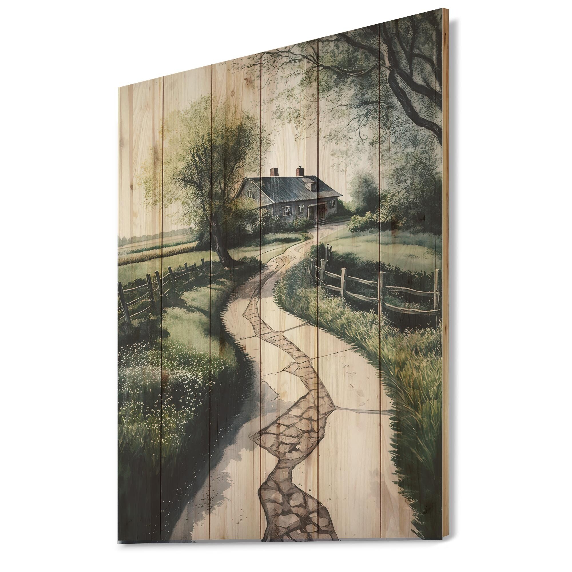 Designart 'Path To the Cottage in Summer'Barn Farm Ranch Wood Wall Art - Natural Pine Wood