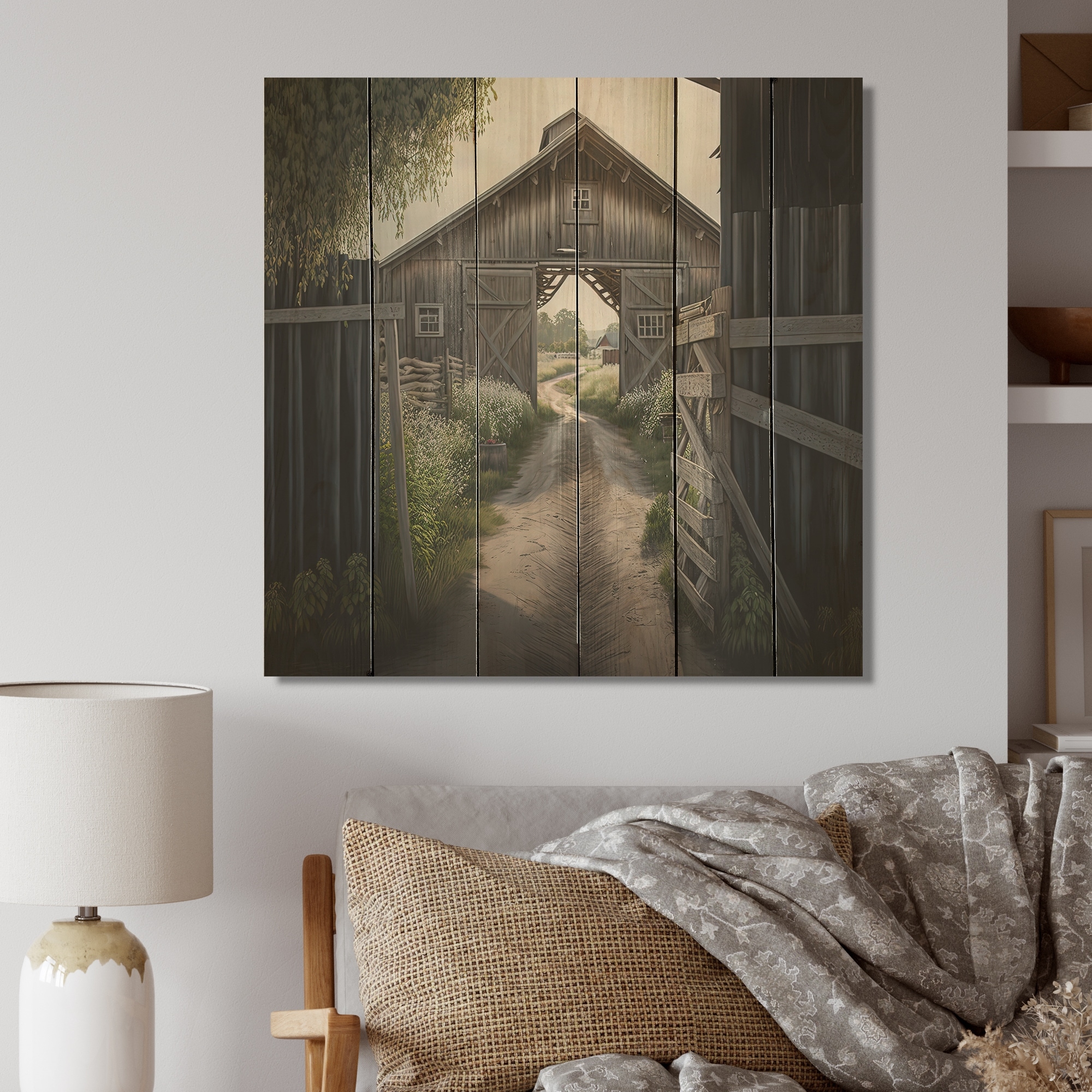 Designart 'Picturesque Winding Path And Barn I' Barn Farm Ranch Wood Wall Art - Natural Pine Wood
