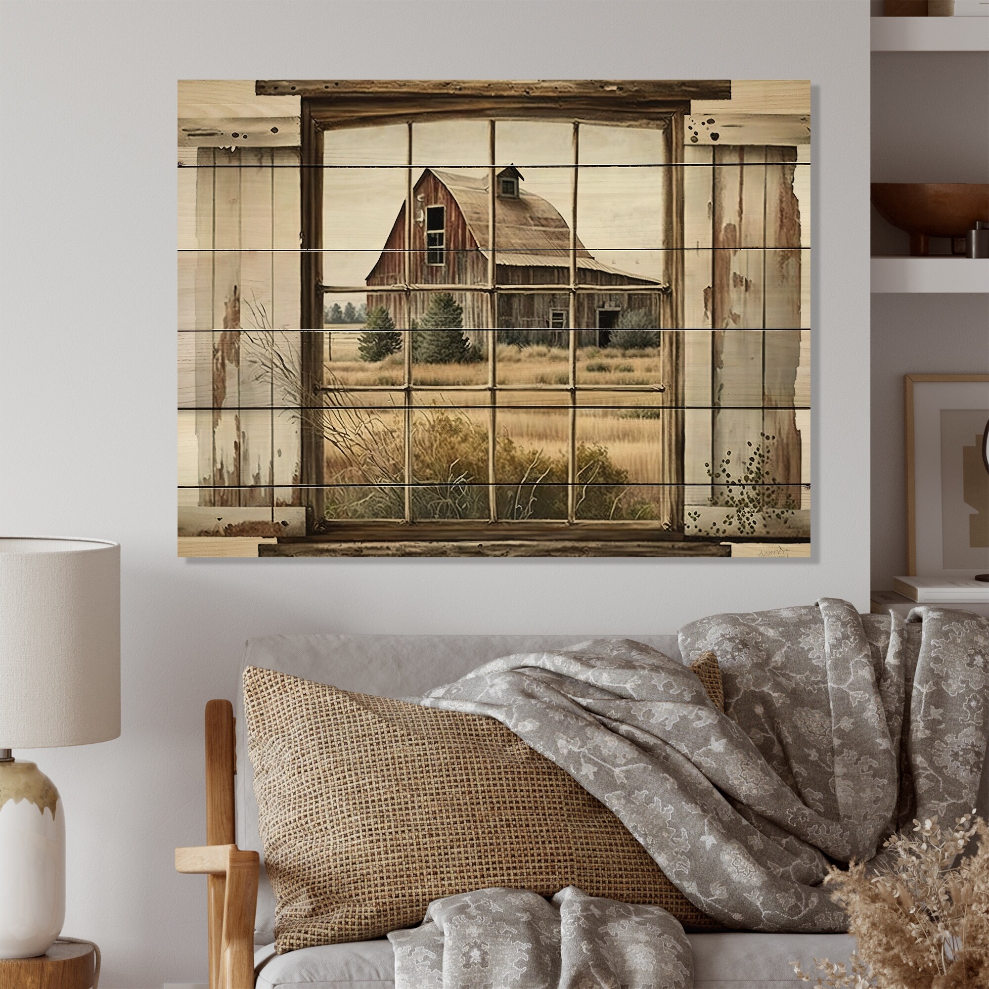 Designart 'Window View to Farm II' Barn Farm Ranch Wood Wall Art - Natural Pine Wood