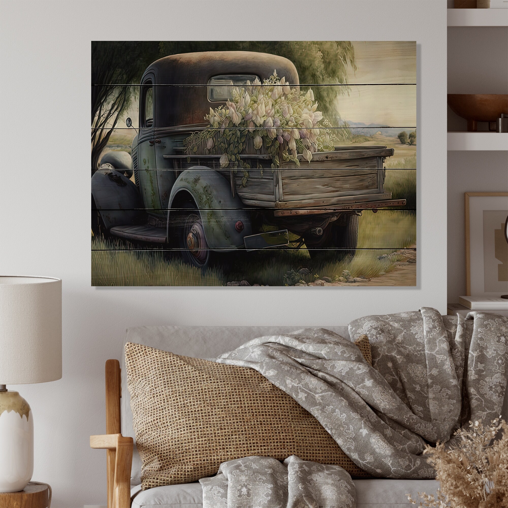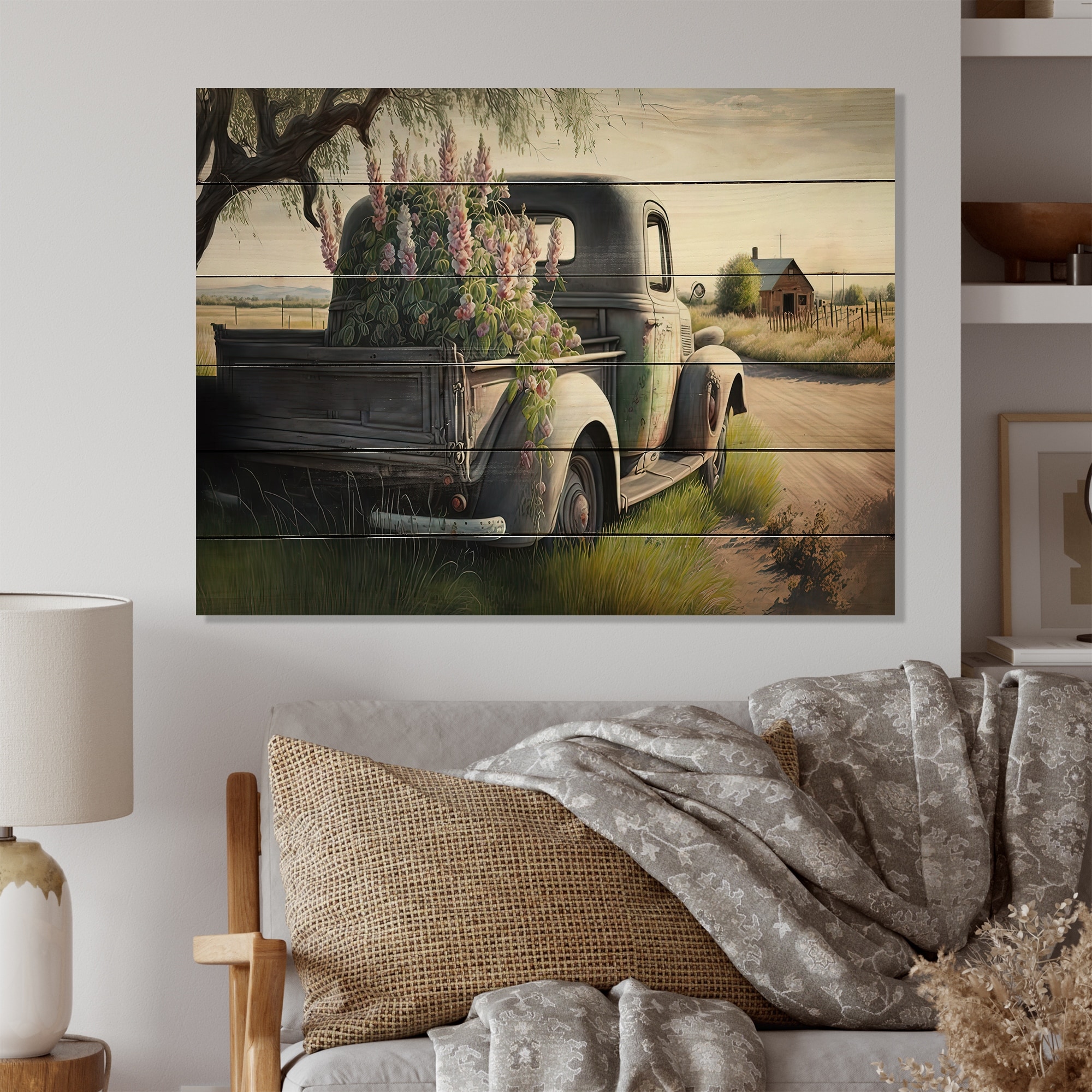Designart 'Barn Flower Delivery Truck VII' Barn Farm Ranch Wood Wall Art - Natural Pine Wood