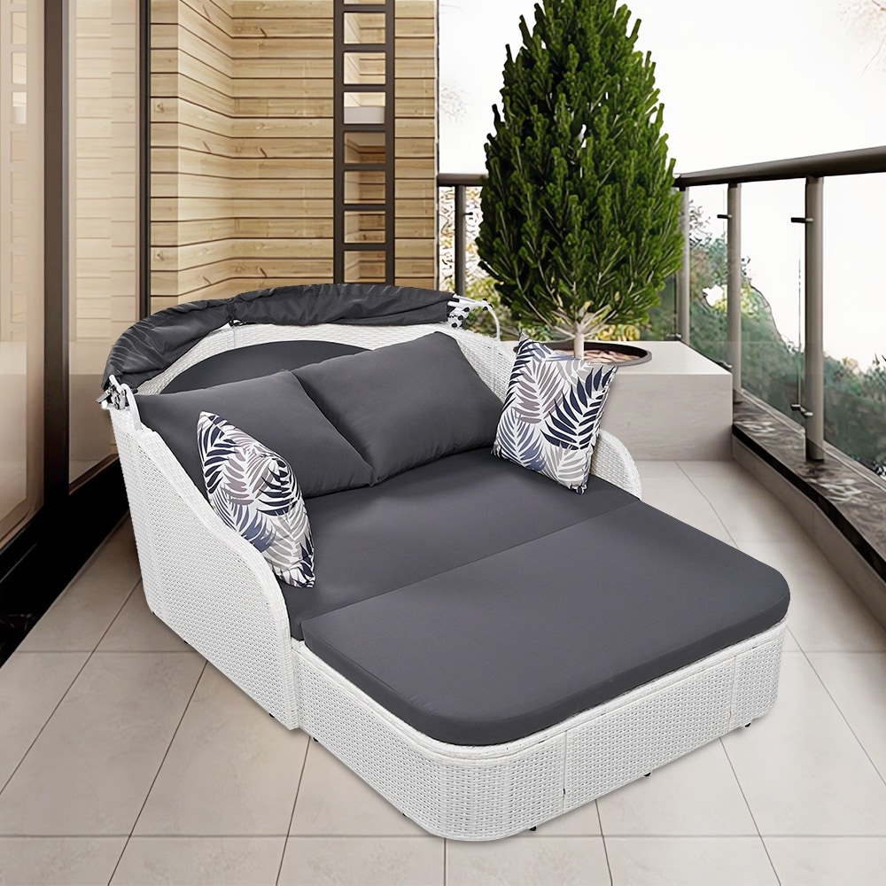 Outdoor 79.9"L PE Rattan Daybed with Adjustable Canopy and Cushions