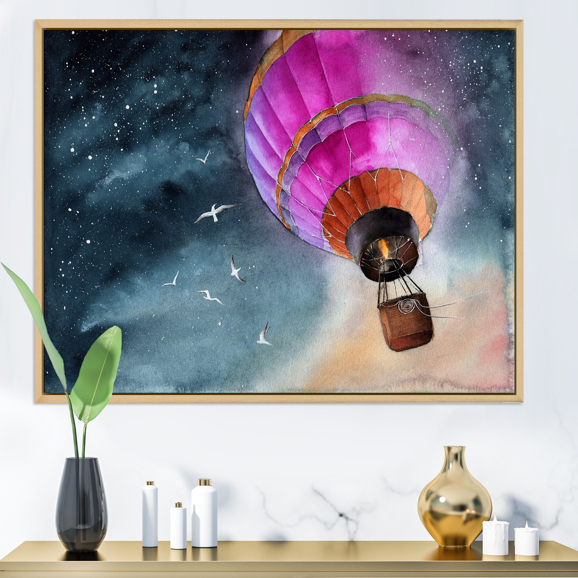 Designart "Pink Air Balloon in Starry Night" Country Framed Canvas Wall Art Print