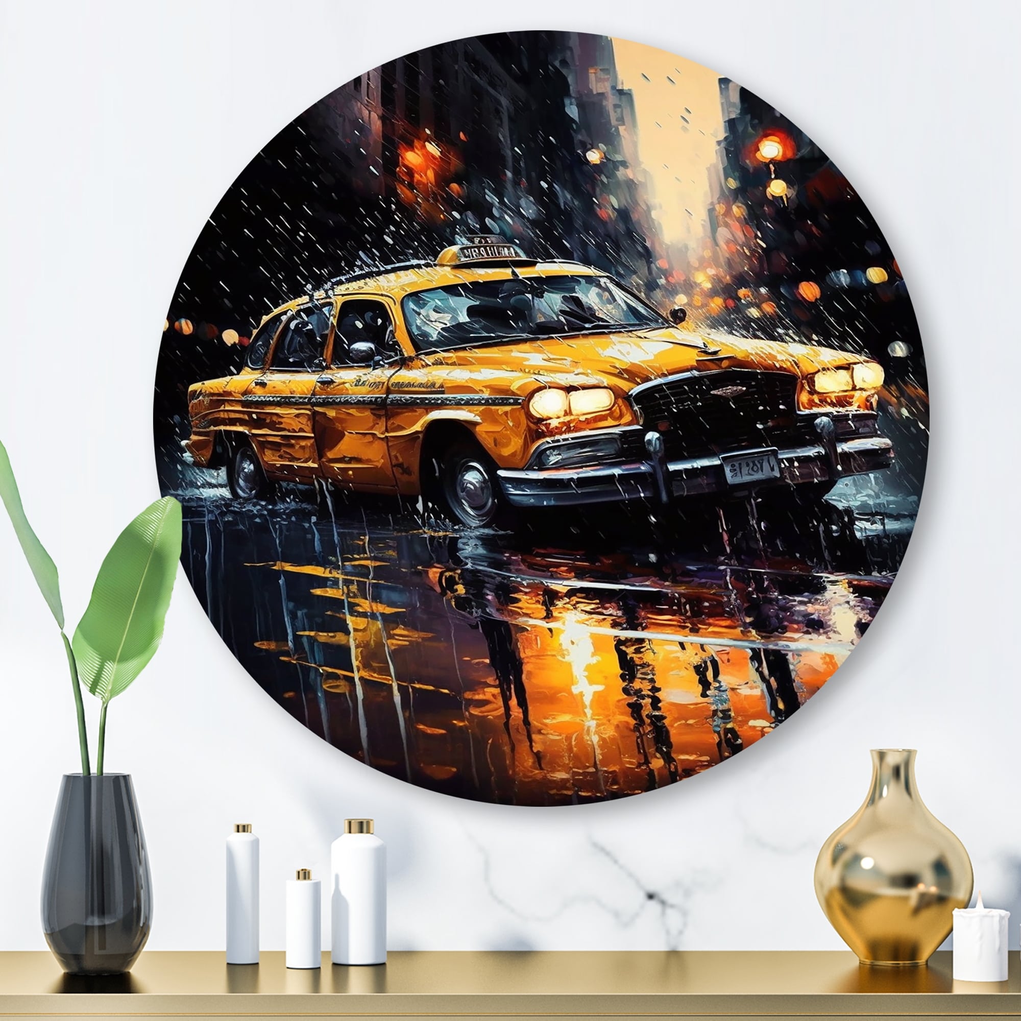 Designart "Taxi In the Rain` II" Retro Car Metal Round Wall Art