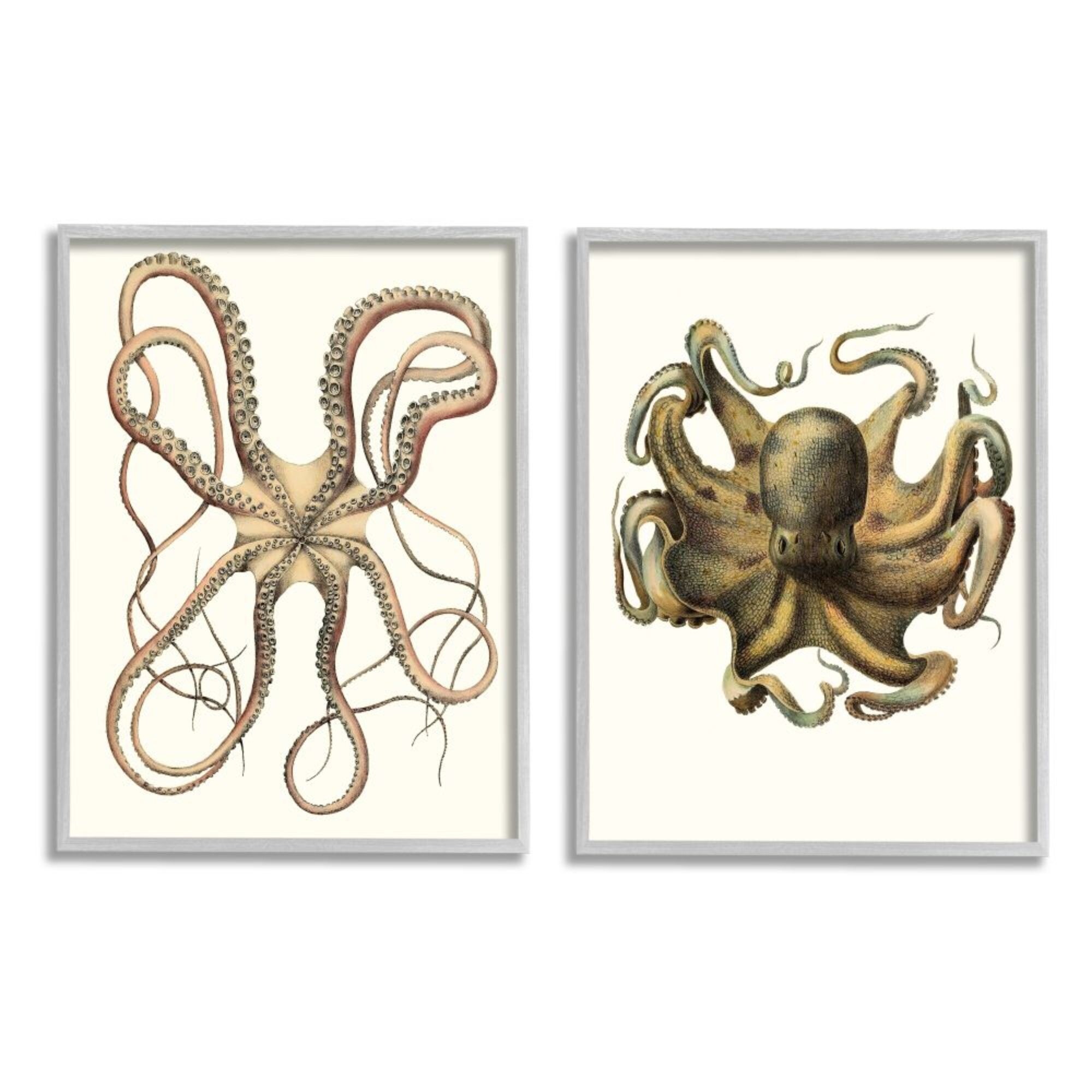 Stupell Industries Vintage Octopus Illustration Curved Tentacles, 2pc Multi Piece Framed Wall Art Set