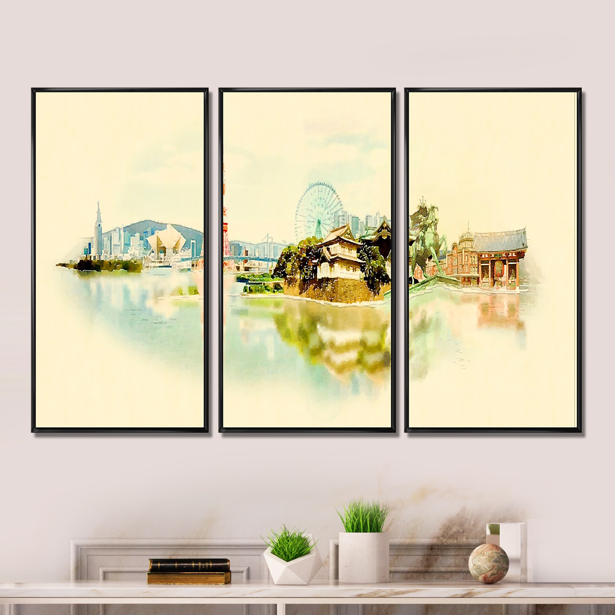 Designart "Tokyo Skyline" Cityscape Framed Canvas Wall Art Set of 3 - 4 Colors of Frames