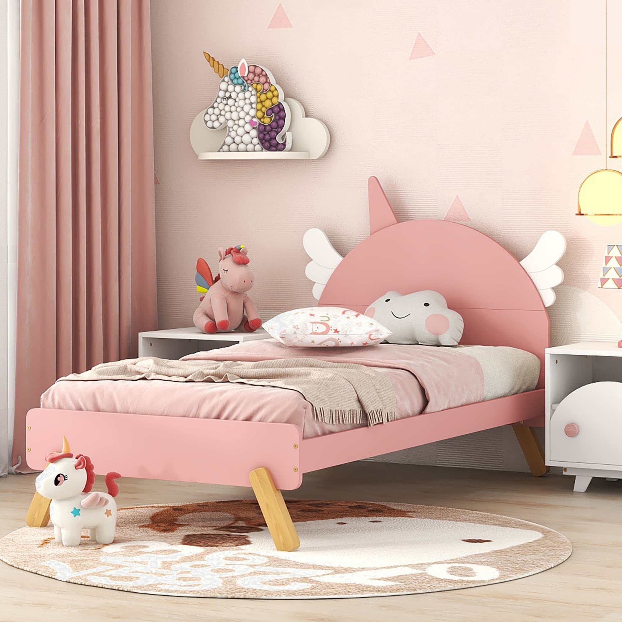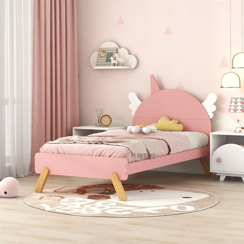Twin Size Pink Wooden Platform Bed With Unicorn Shape Headboard