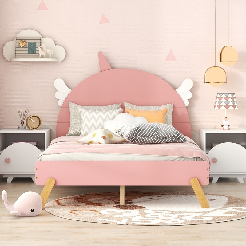 Pink Unicorn Wooden Full Size Platform Bed with Unicorn Shape Headboard