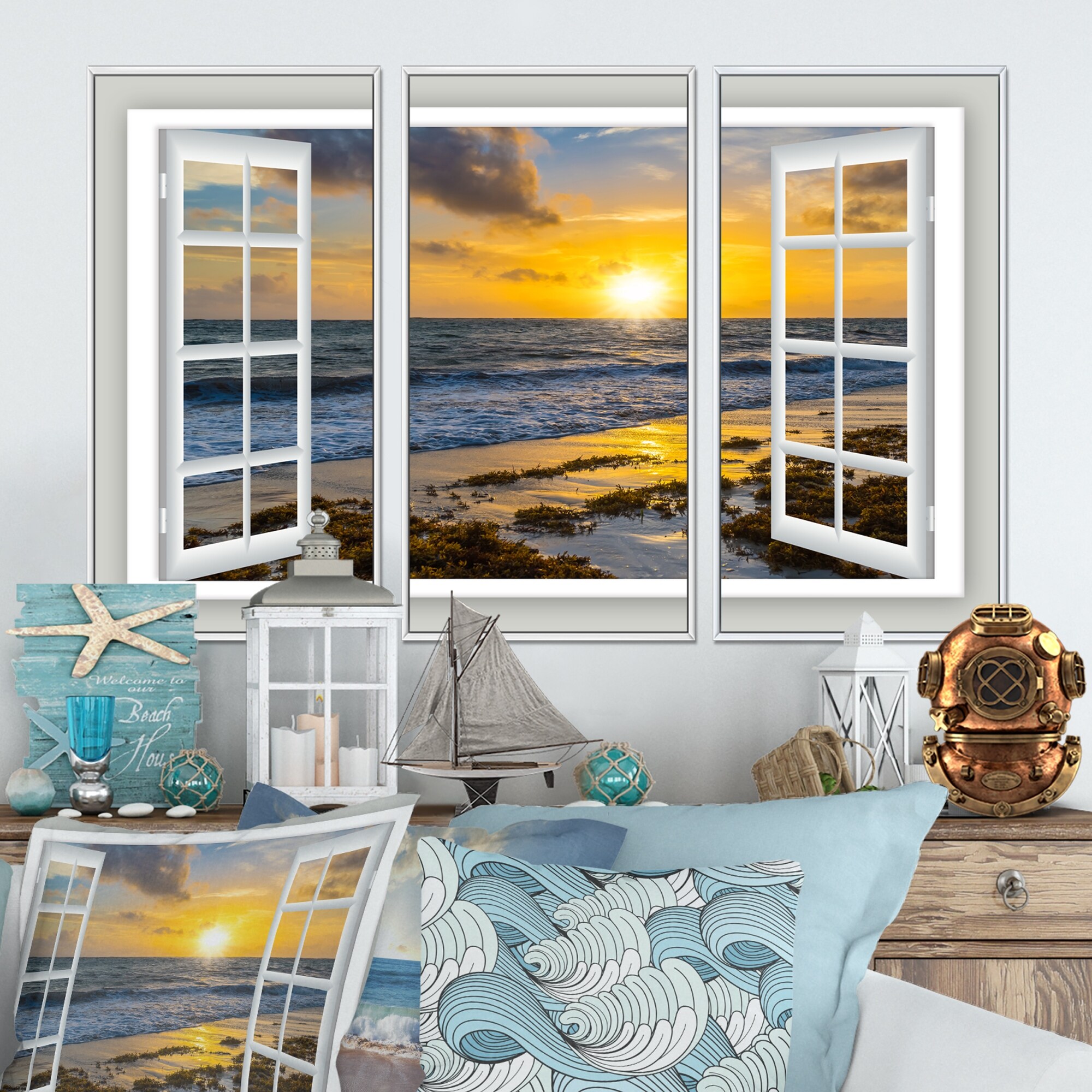 Designart "Open Window to Bright Yellow Sunset" Sea & Shore Framed Canvas Wall Art Set of 3 - 4 Colors of Frames