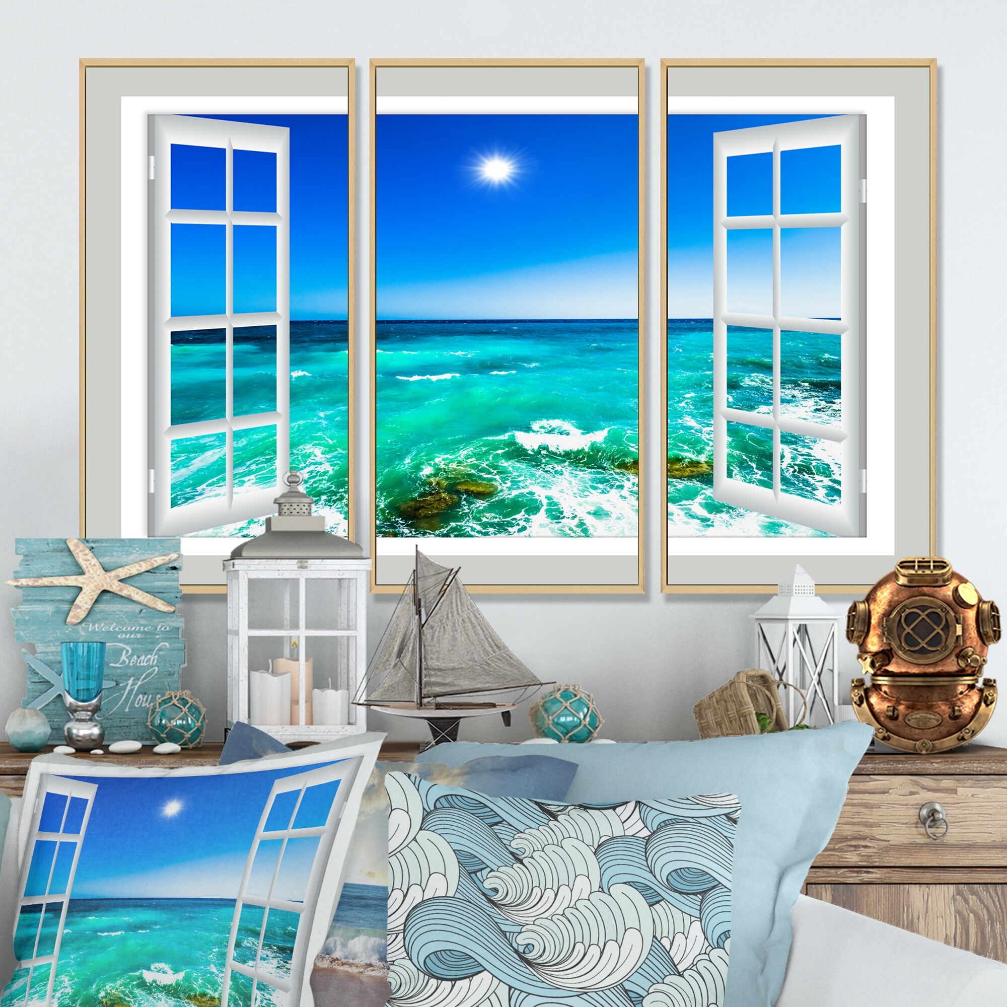 Designart "Window Open to Sunny Summer Sea" Sea & Shore Framed Art Prints Set of 3 - 4 Colors of Frames