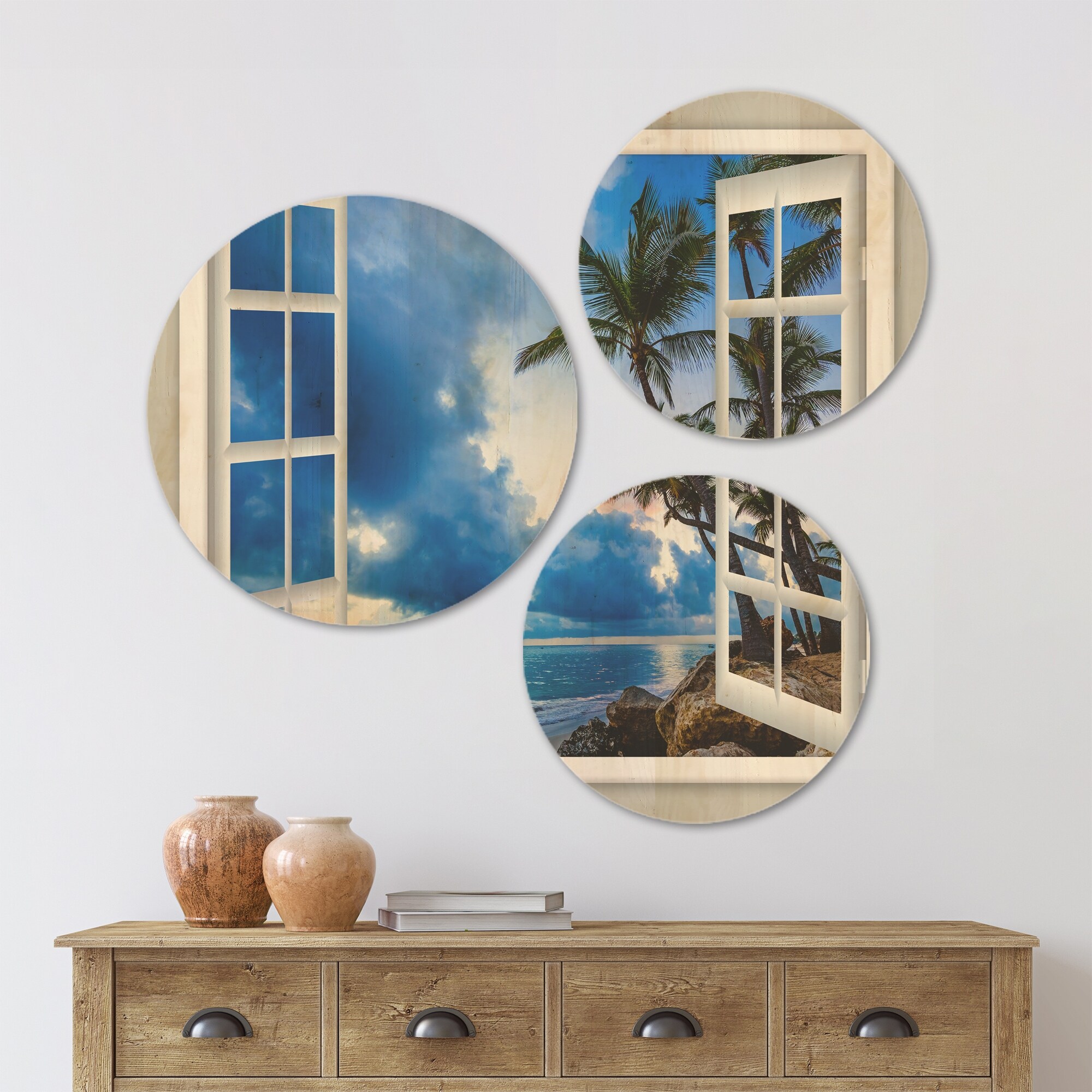 Designart 'Window Open to Cloudy Blue Sky' Landscape Wood Wall Art Set of 3 Circles
