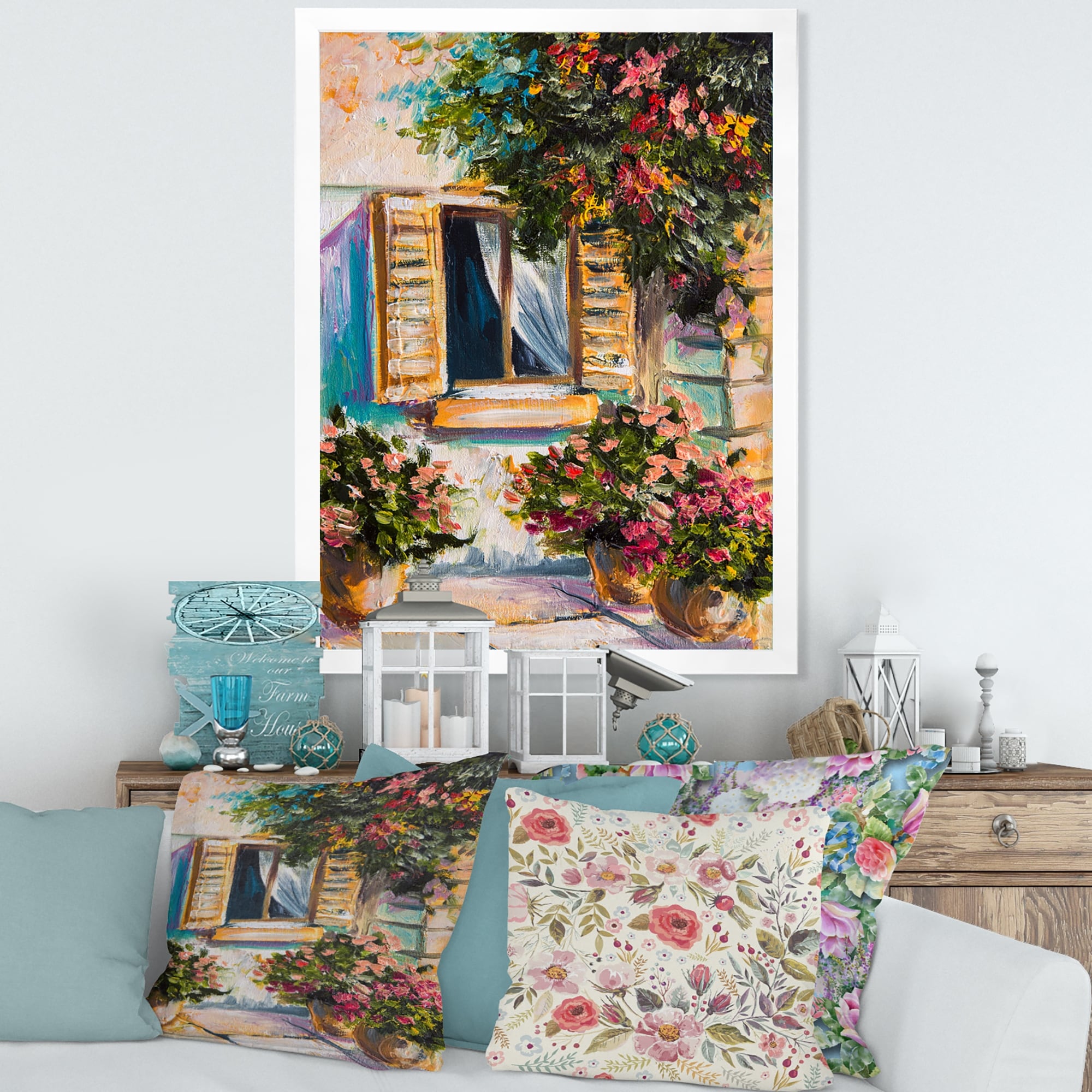 Designart "Open Window With Vibrant Flowers in Greek Street" Colonial Framed Art Print