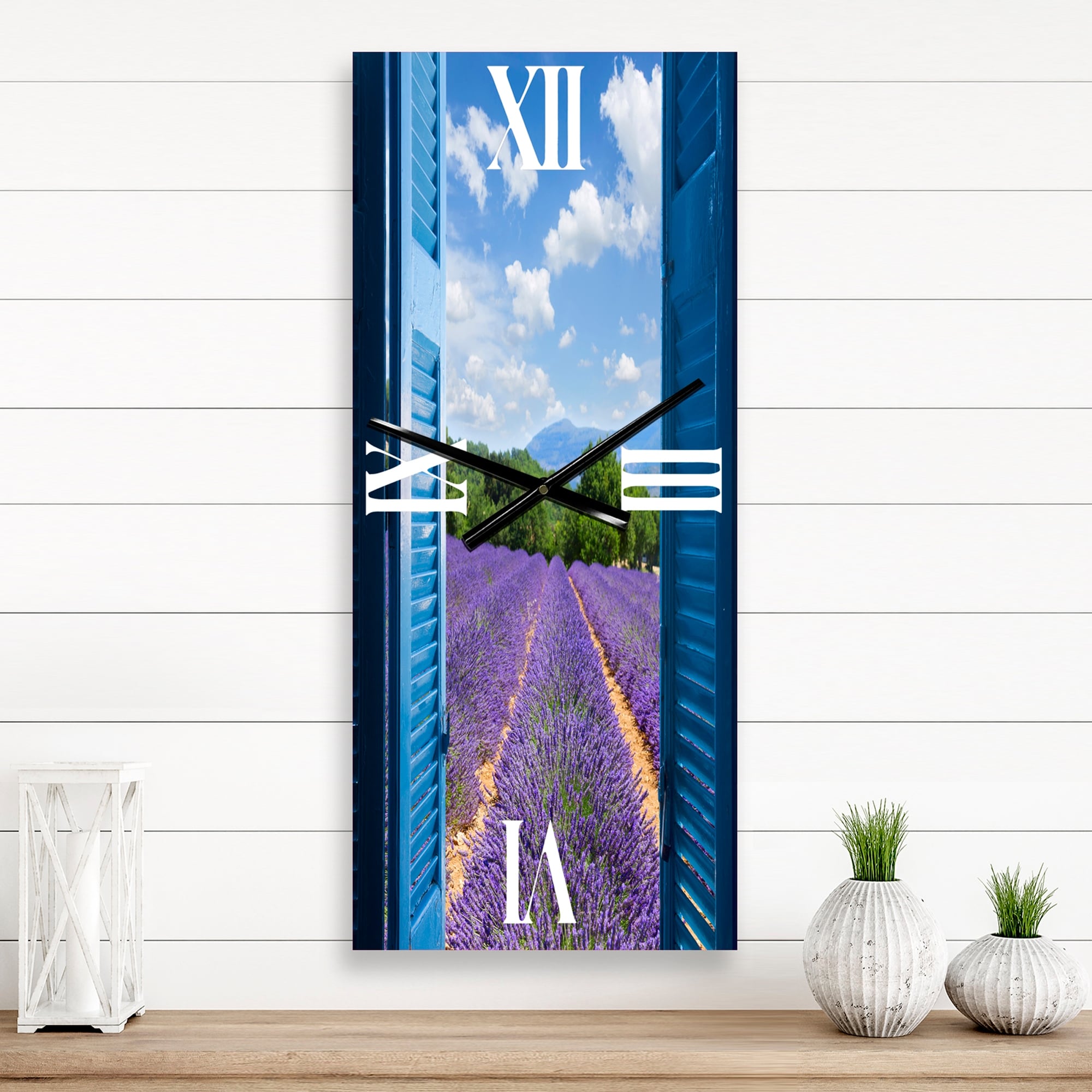 Designart 'Lavender Field Through Blue Open Cottage Window' Farmhouse Wall Clock Decor