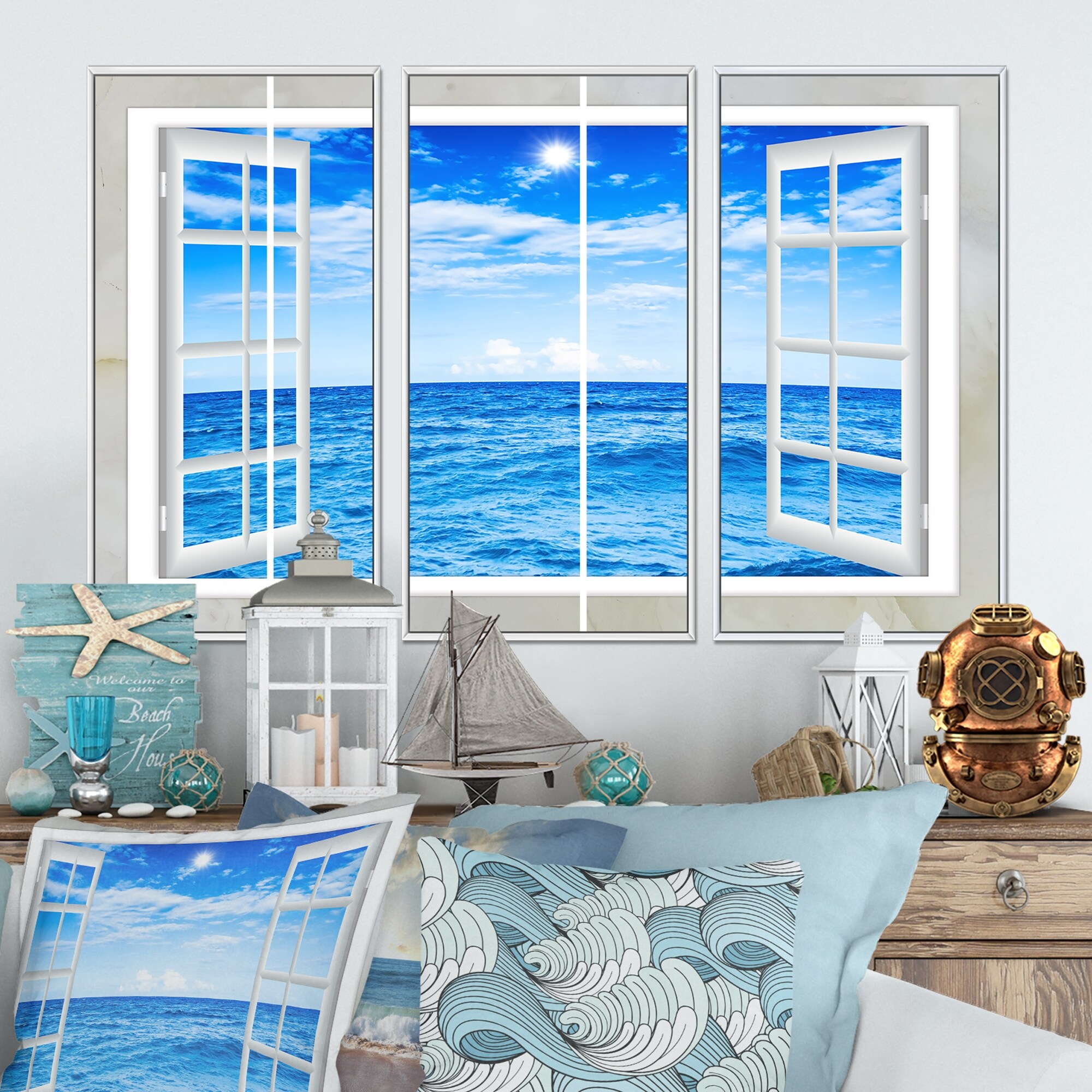Designart "Window Open to Blue Wavy Ocean" Sea & Shore Framed Wall Art Set of 3 - 4 Colors of Frames