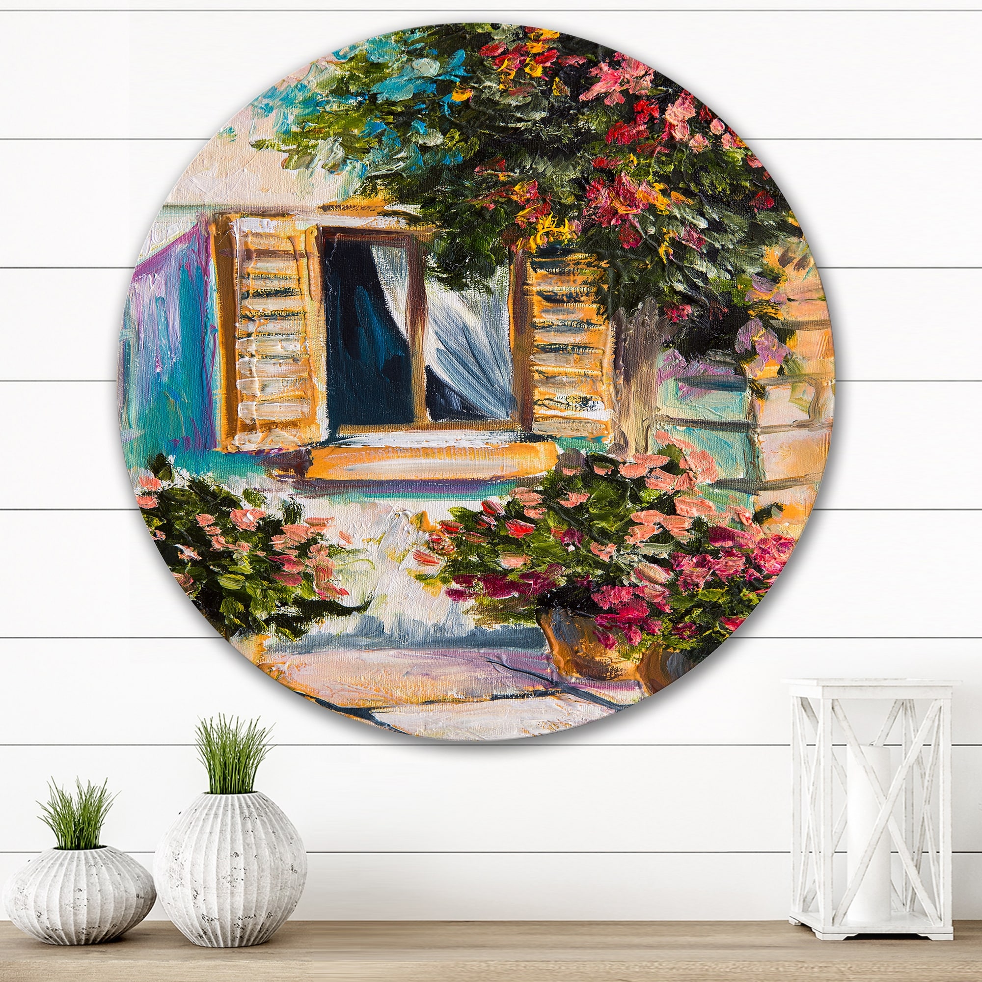 Designart 'Open Window With Vibrant Flowers in Greek Street' Colonial Metal Circle Wall Art