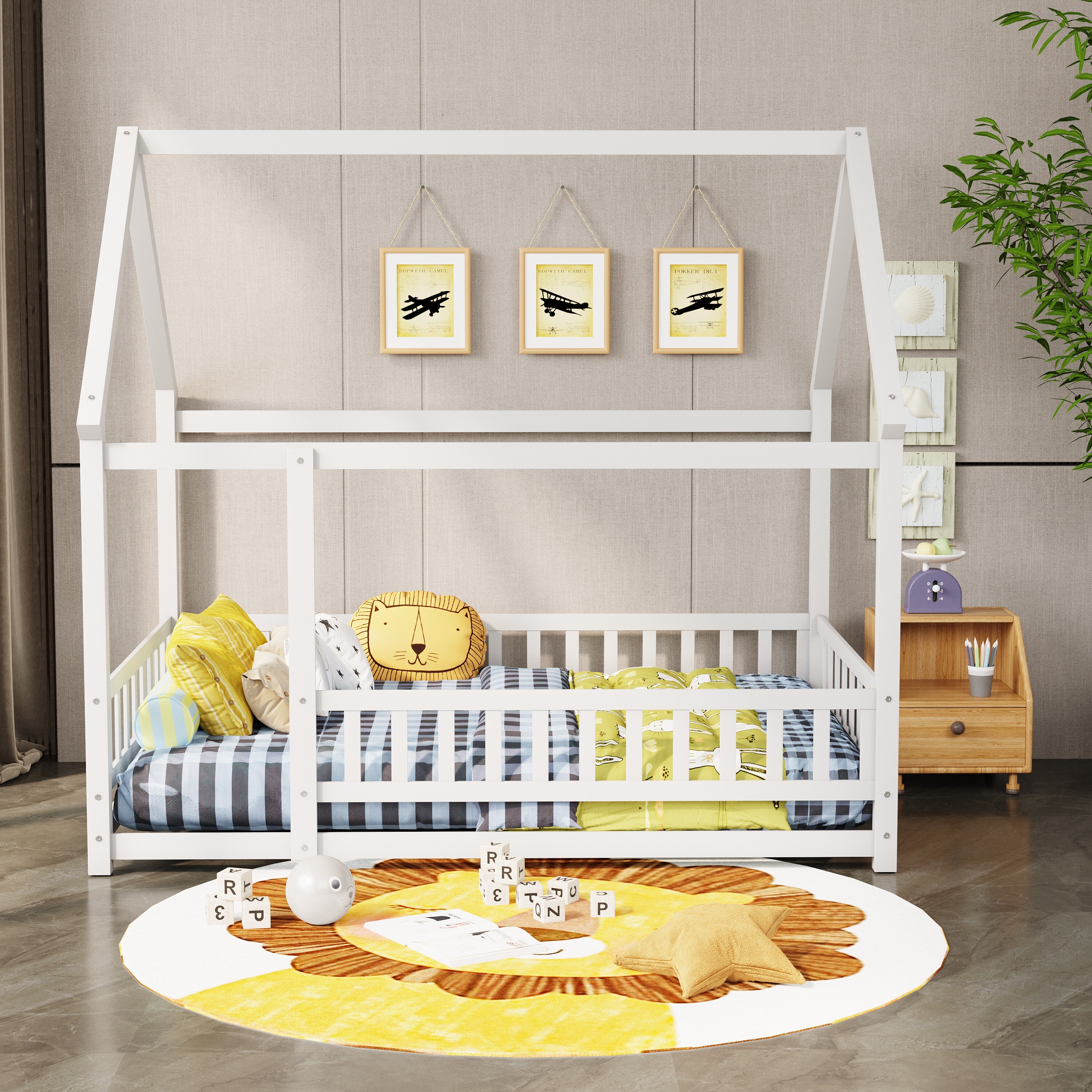 Twin Size Floor Wooden Bed with House Roof Frame And Fence Guardrails, Easy Assembly (Thickness Less Than 6 Inches Is Suggested)