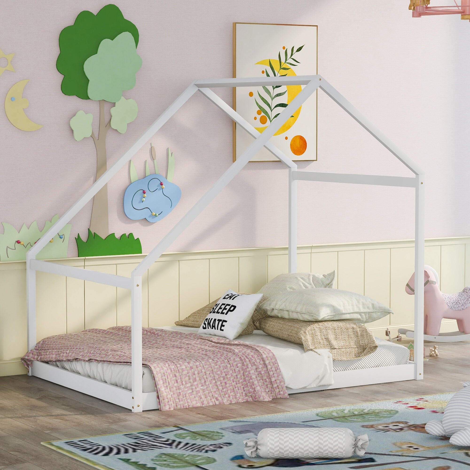 Twin Size Wooden Simplistic House Bed, Kids House Floor Bed Frame