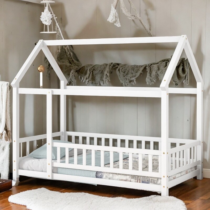 Twin Size Wooden Simplistic House Bed, Kids House Floor Bed Frame, White