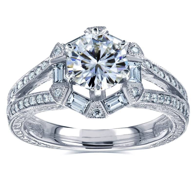 Annello by Kobelli 14k White Gold 1 1/2ct TGW Round-cut Moissanite and Diamond Art Deco Split Shank Engagement Ring