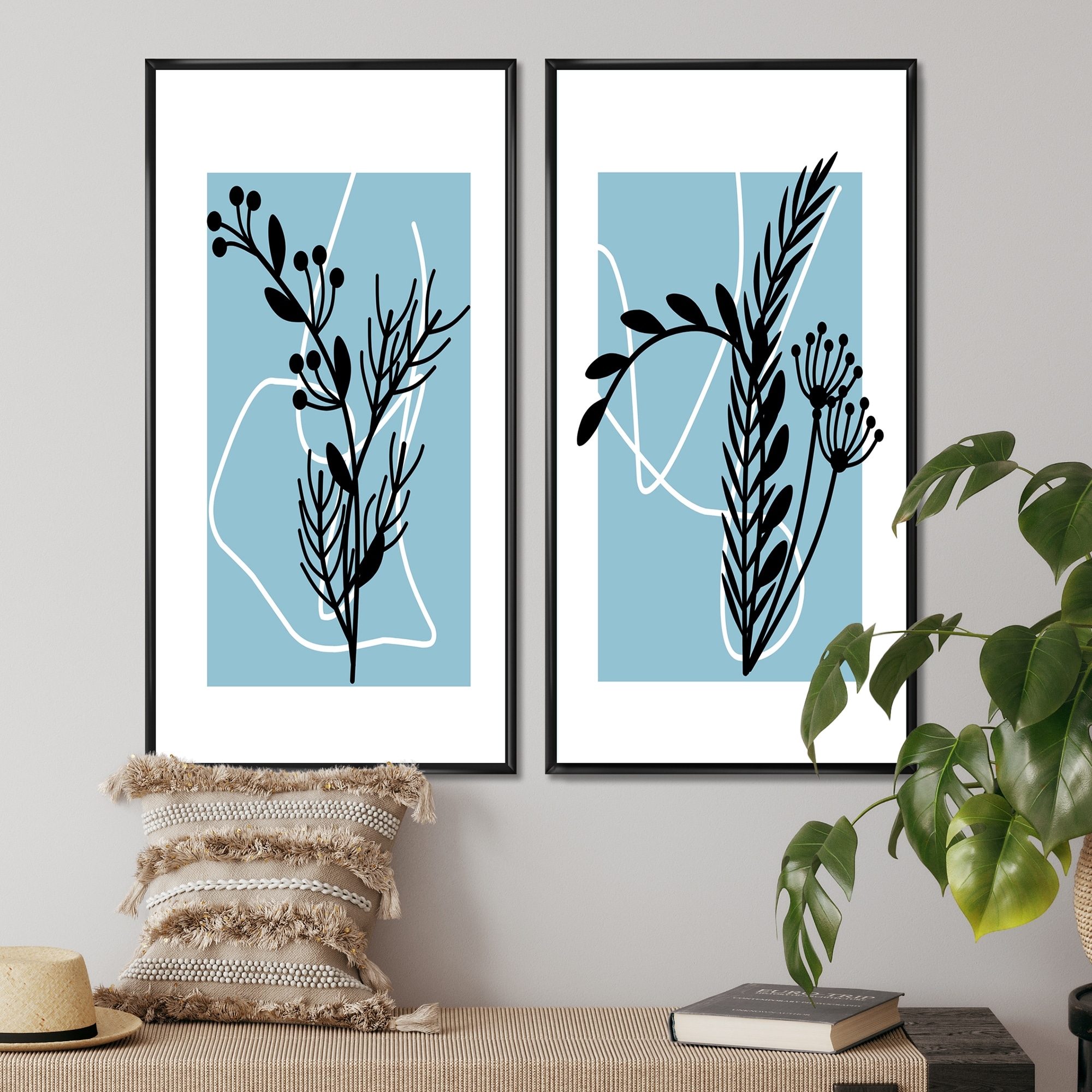 Designart "Botanical Silhouettes on Blue Pastel I" Floral Framed Art Set of 2 Pieces