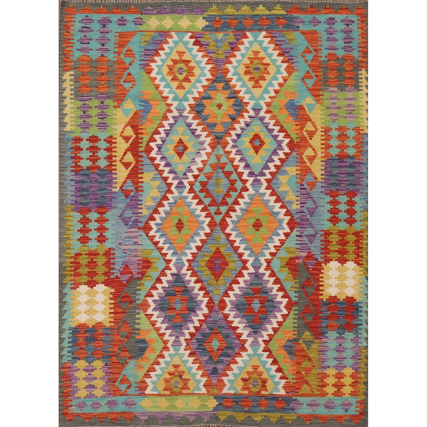Colorful Geometric Kilim Oriental Area Rug Flat-weave Wool Carpet - 5'1"x 6'8"