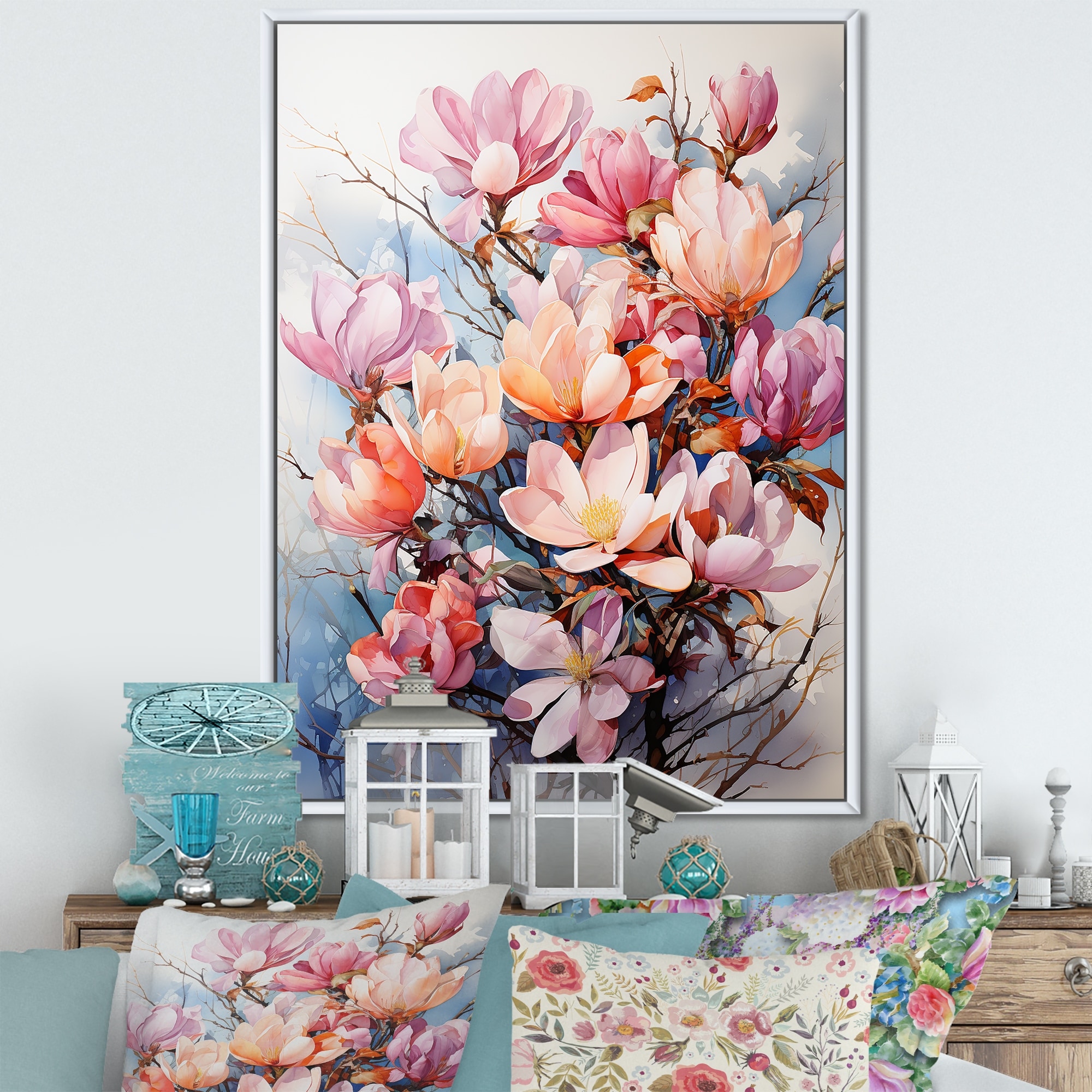 Designart "Pink Blue Magnolias Representation Multicolored Acrylic I" Magnolias Framed Canvas Wall Art
