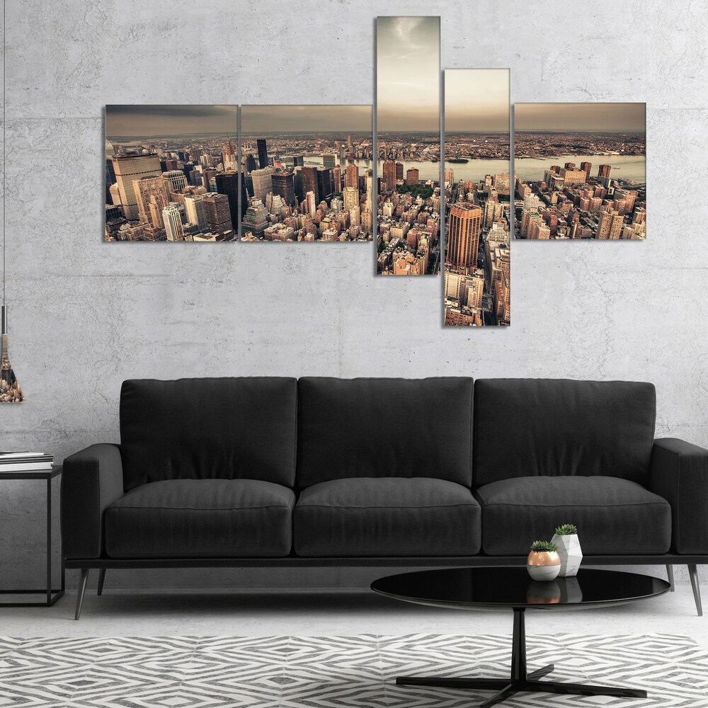 Designart "Manhattan Skyscrapers Aerial View" Modern Cityscape Canvas Art Print - Brown