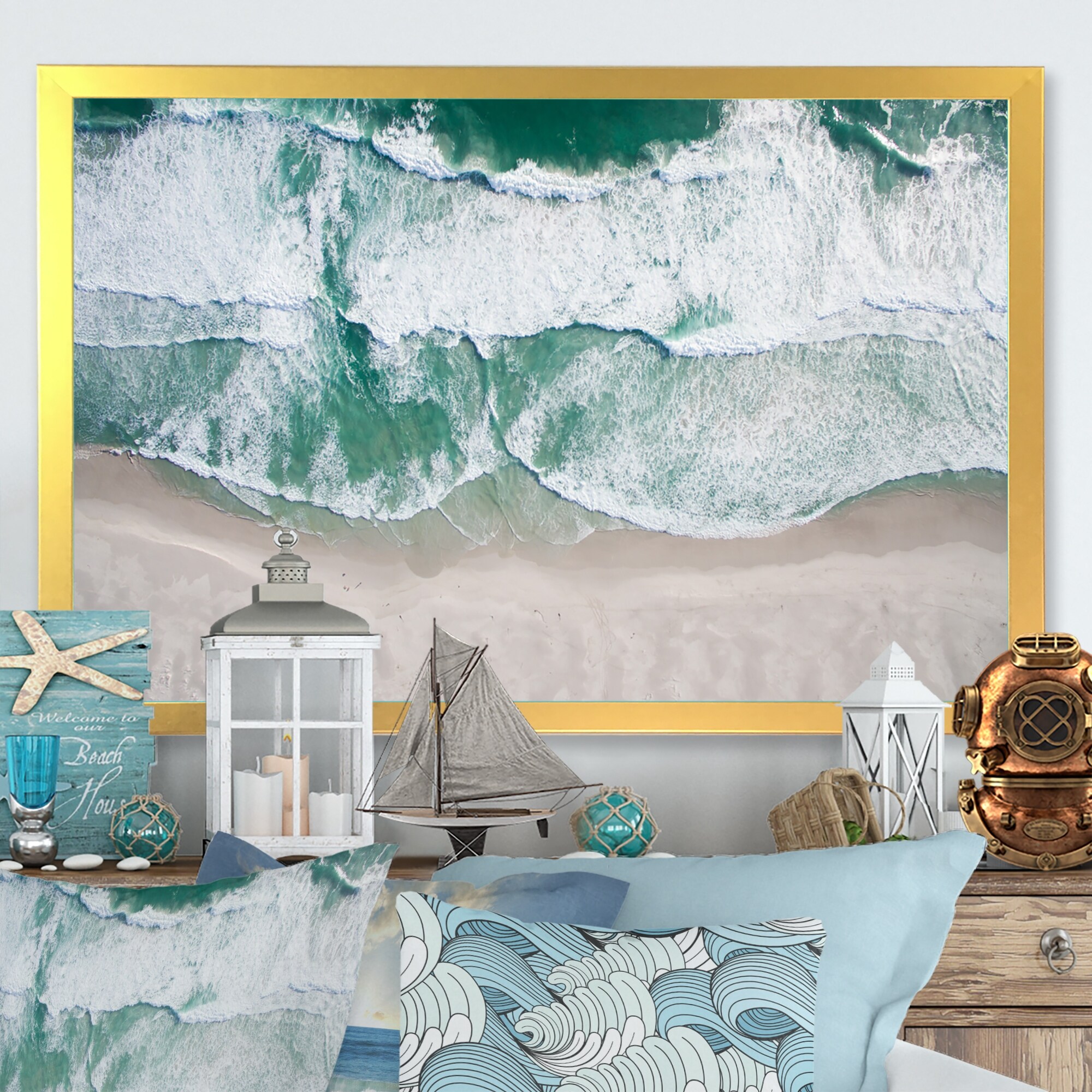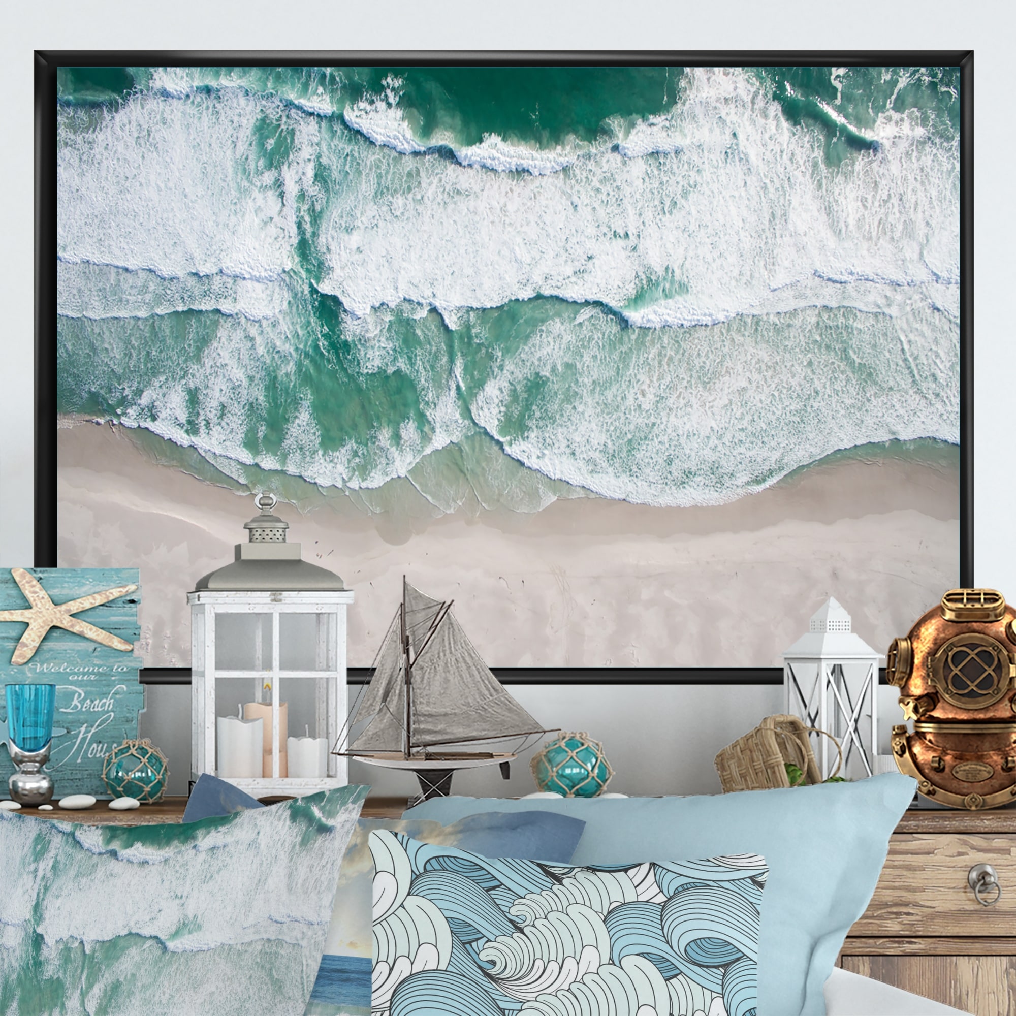 Designart "Aerial View Blue Ocean Waves" Nautical & Coastal Framed Canvas Wall Decor