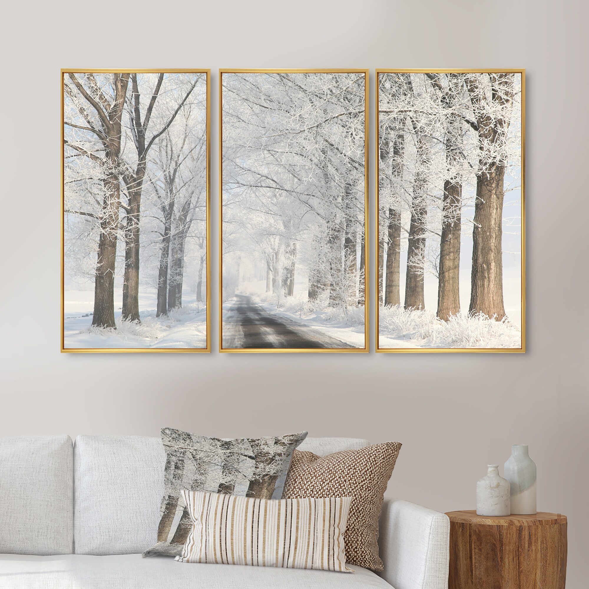 Designart "Road Through Frosted Forest" Landscape Framed Wall Decor Set of 3 - 4 Colors of Frames
