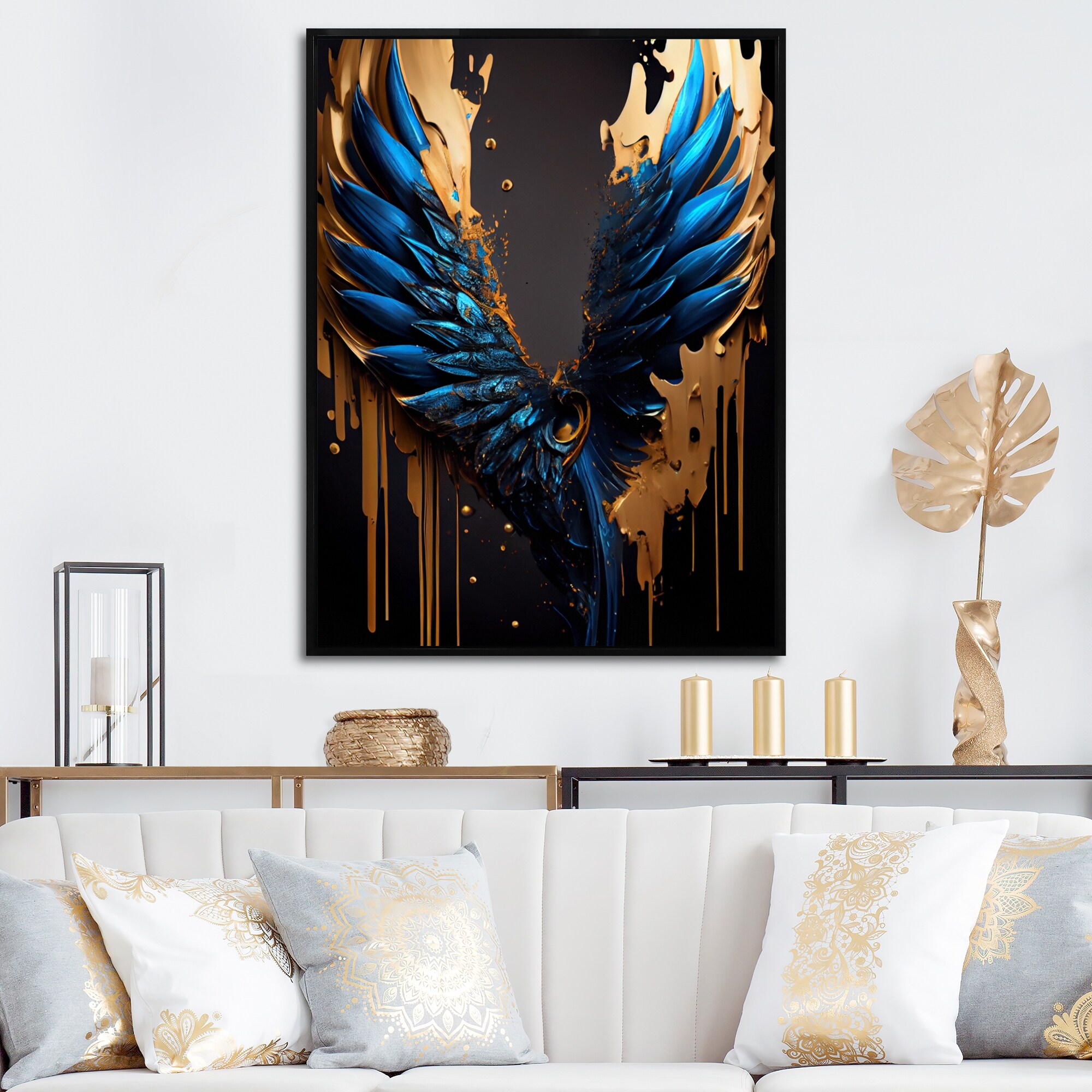 Designart "Blue And Gold Angel Wings II" Contemporary Glam Framed Canvas Art Print