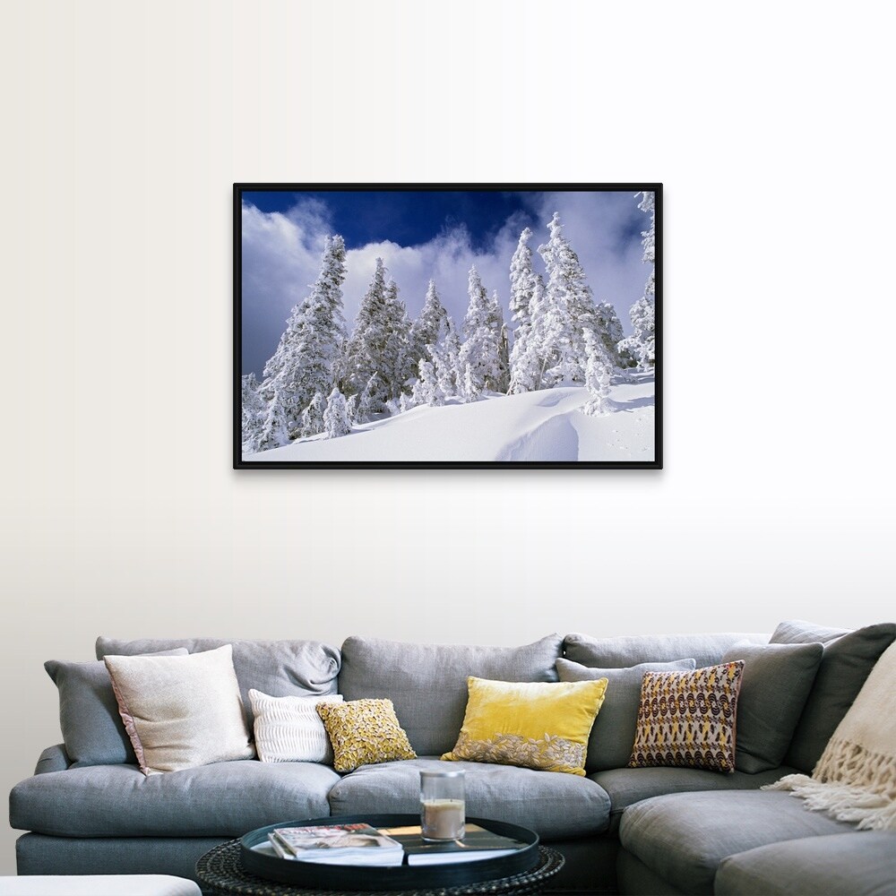 "Low-Angle View of Snow-Covered Pine Trees" Black Float Frame Canvas Art