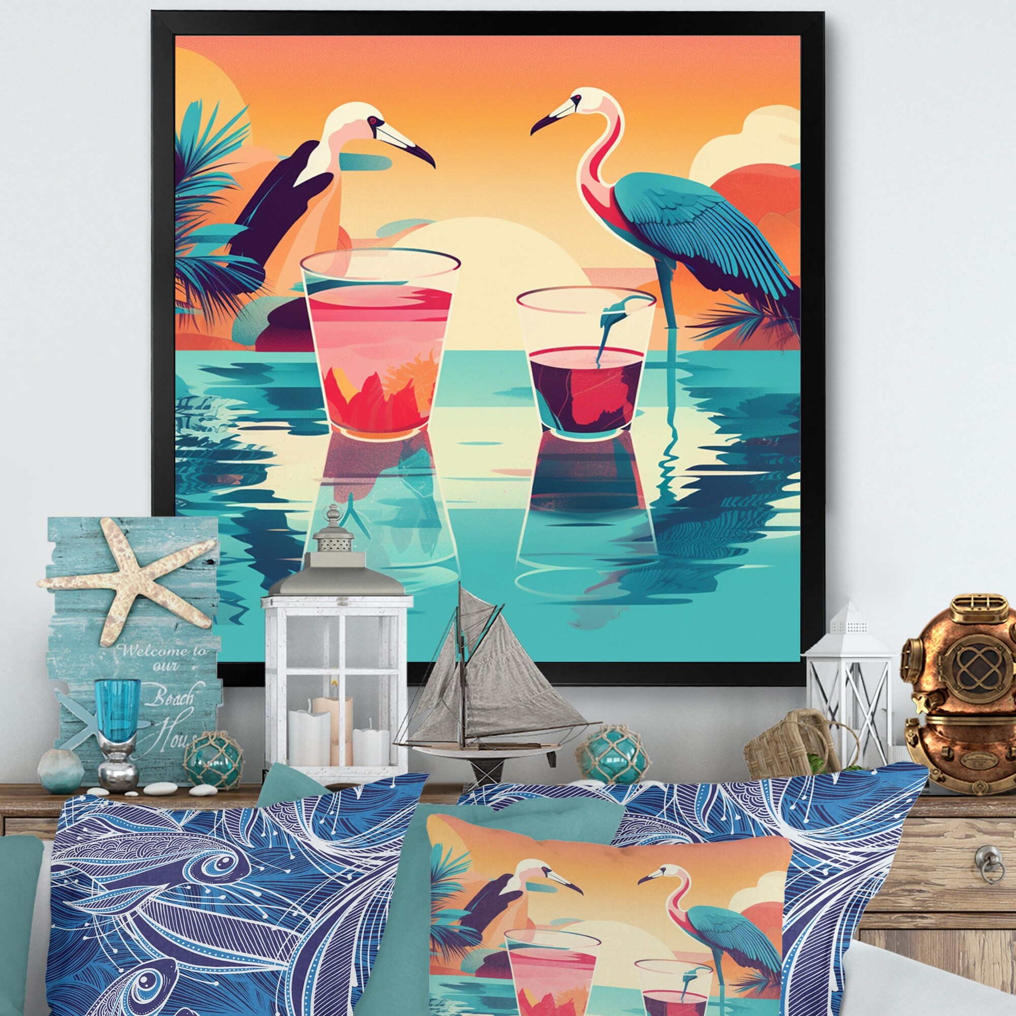 Designart "Blue Pink Flamingos in the Sea At Sunset" Animals Flamingo Framed Wall Decor