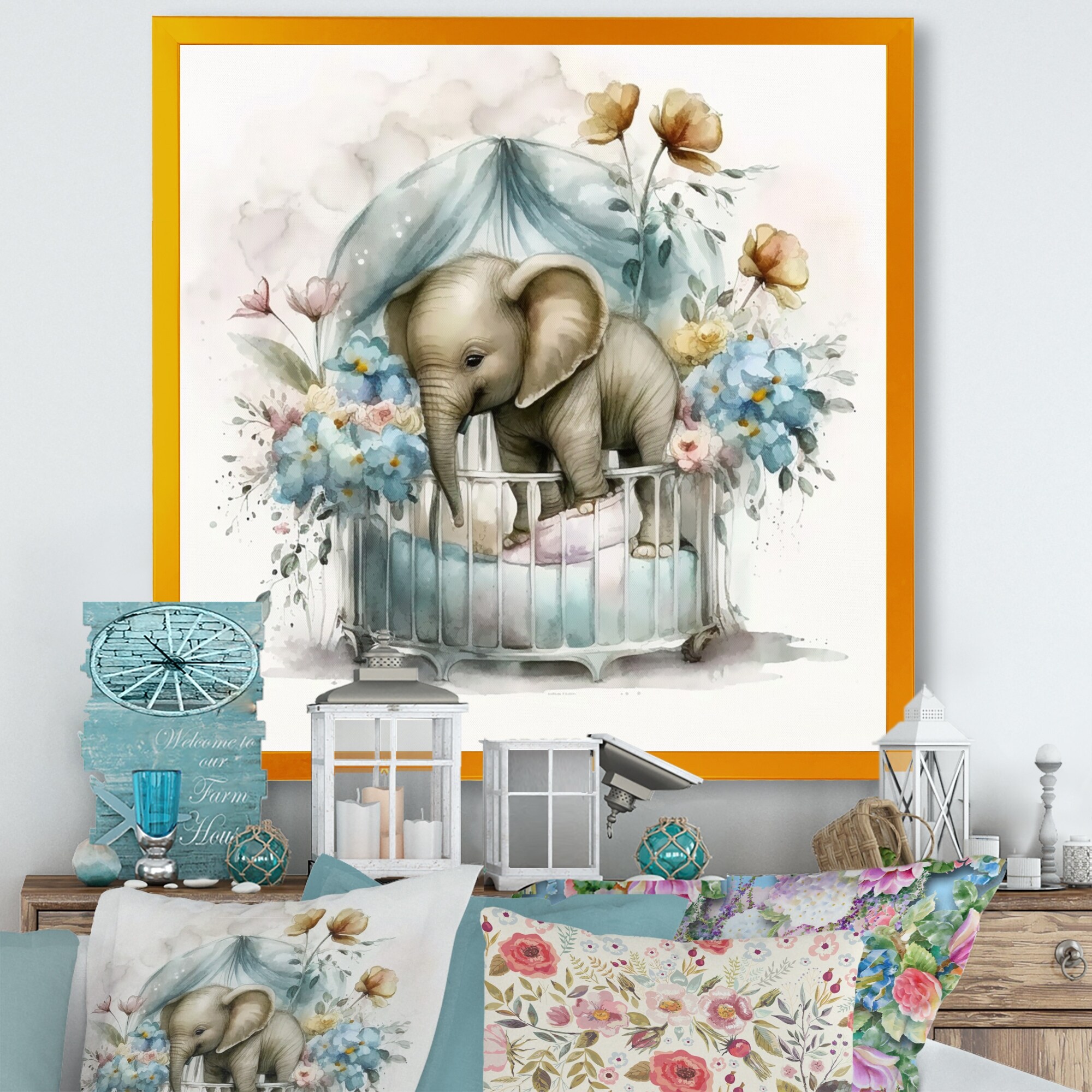 Designart "Baby Elephant in Crib With Flowers II" Animals Framed Art Print