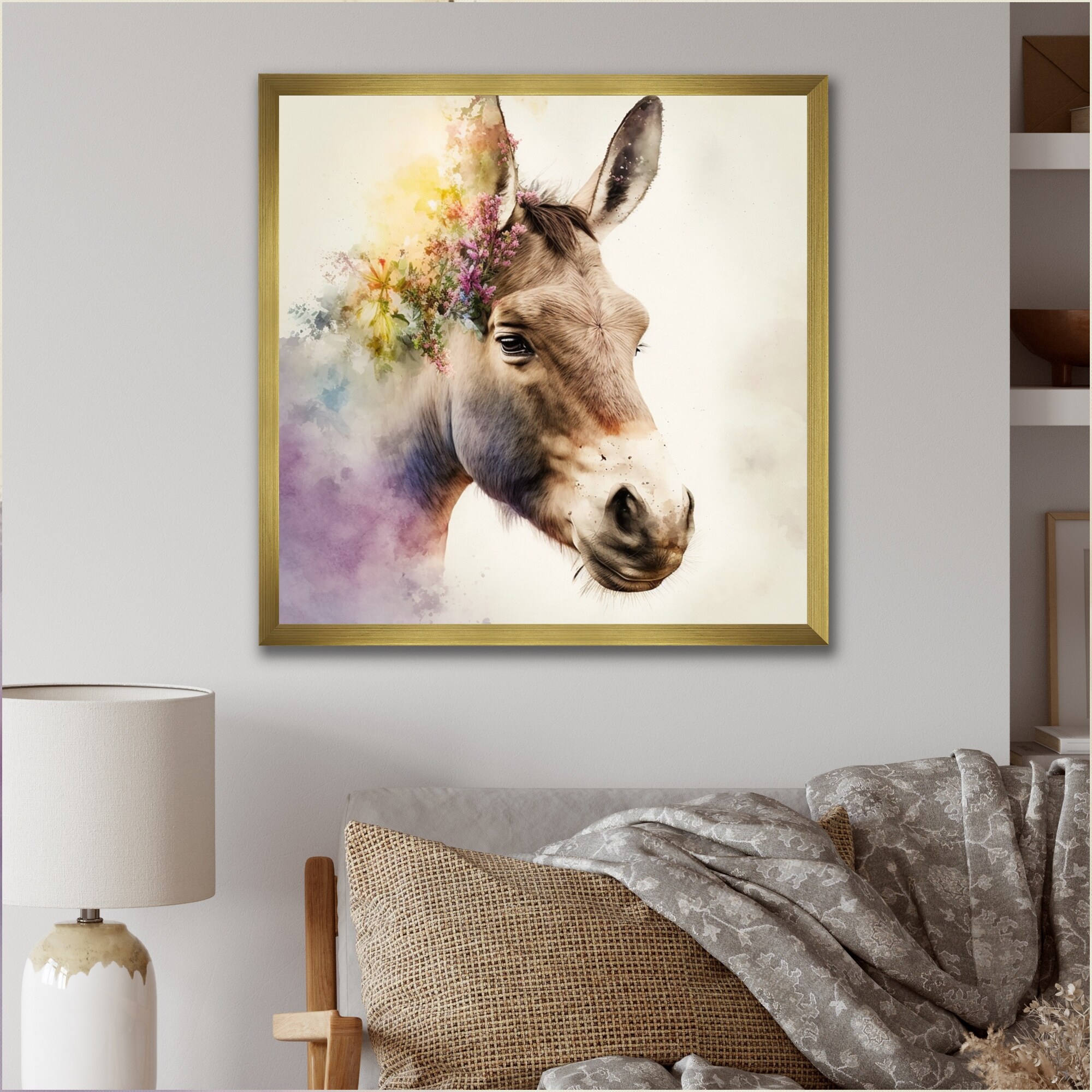 Designart "Brown Portrait Donkey With Flowers I" Animal Donkey Framed Canvas Wall Art