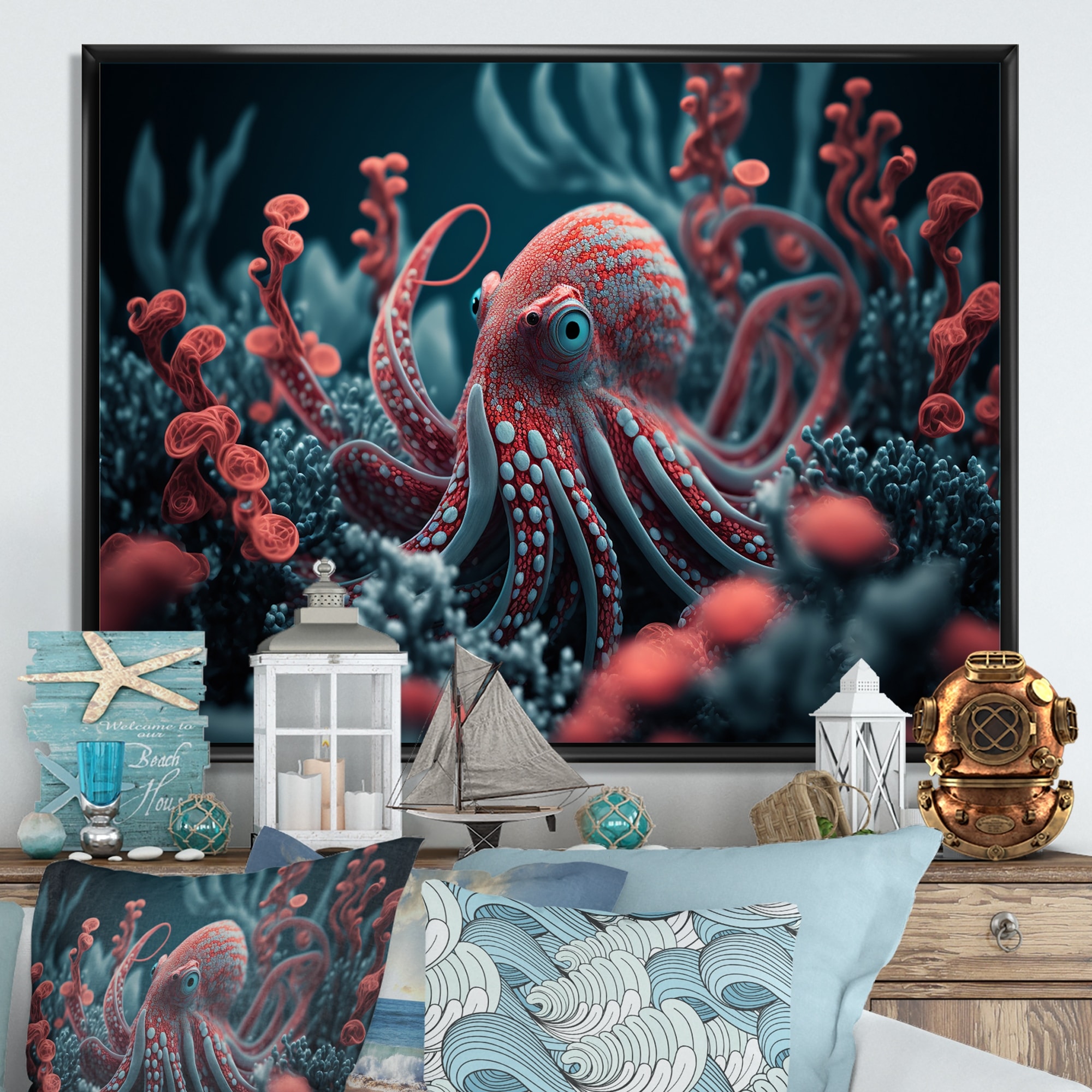 Designart "Red Octopus on the Ocean Floor V" Animal Octopus Framed Canvas Wall Art Print