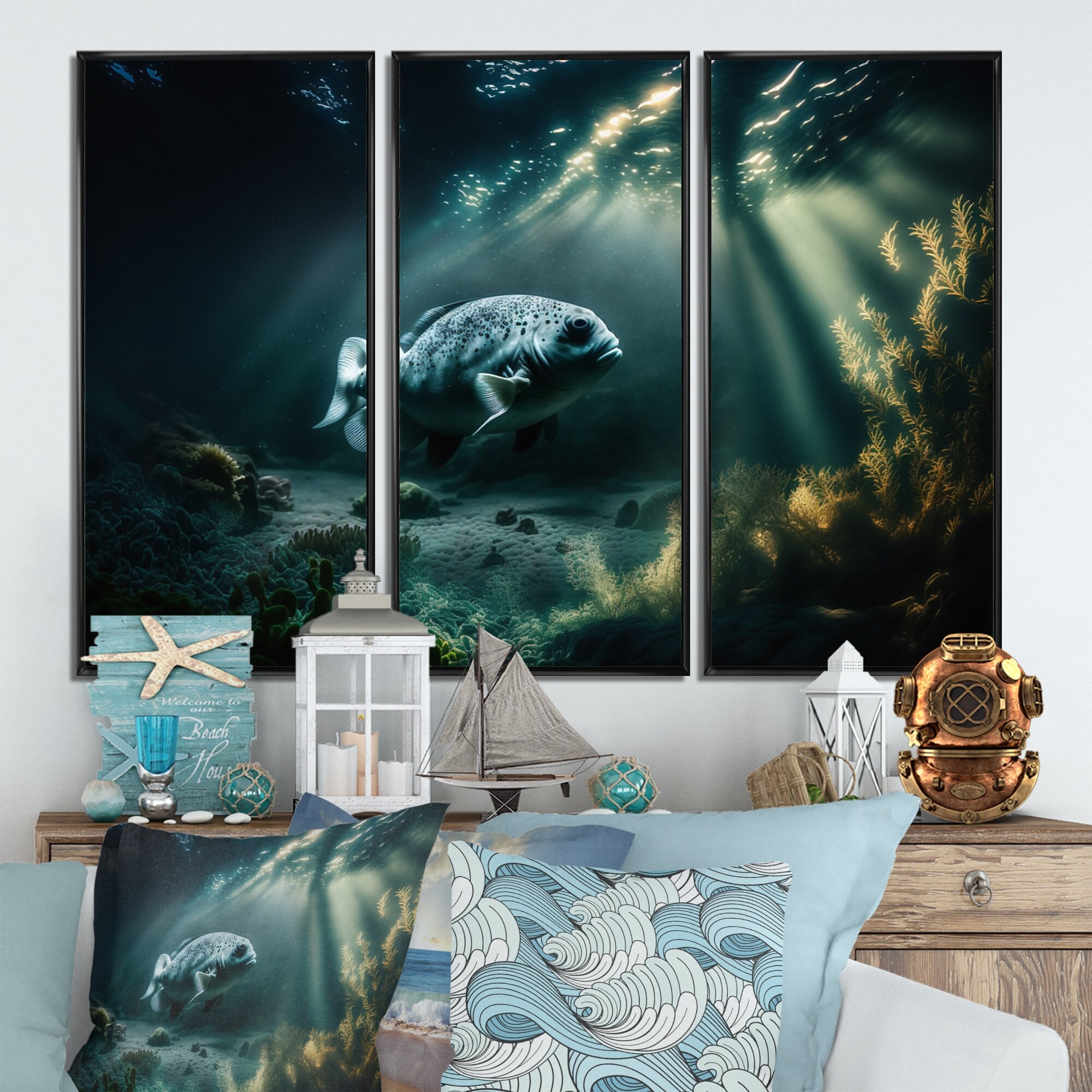 Designart "Deepsea Fish Catching the Sunlight" Animal Fish Framed Canvas Wall Art Print - 3 Panels