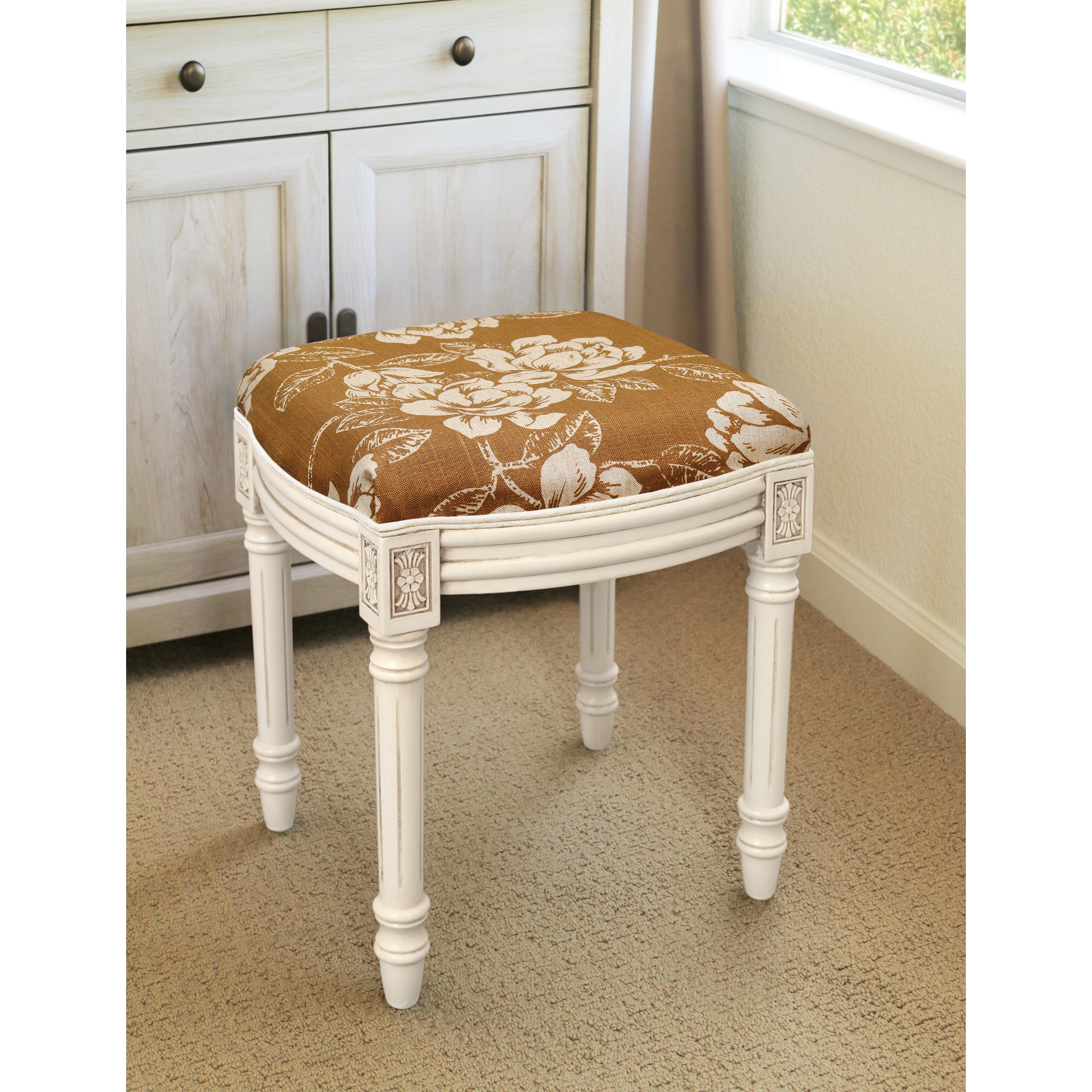 Caramel Magnolia Vanity Stool with antique white finish