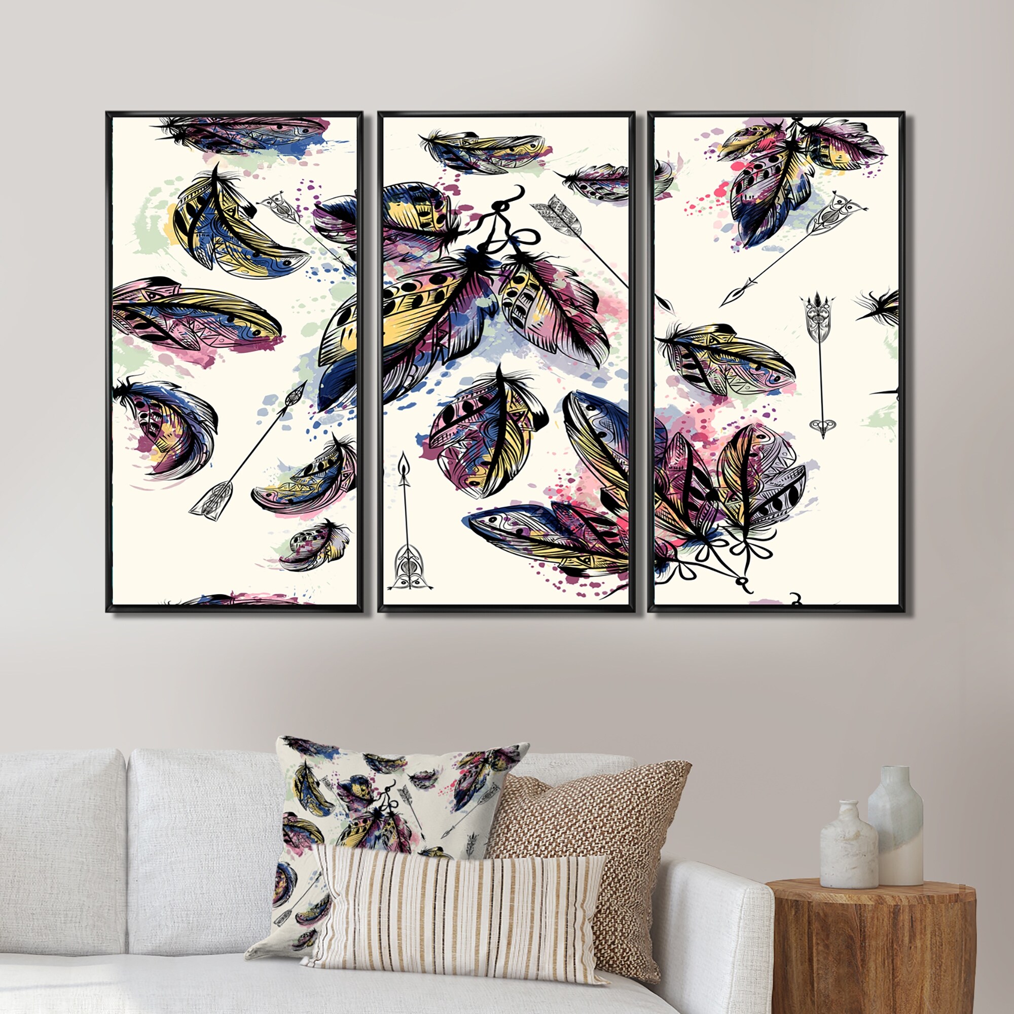Designart "Tribal Boho Feathers And Arrows" Bohemian Framed Canvas Wall Art Print Set of 3 - 4 Colors of Frames