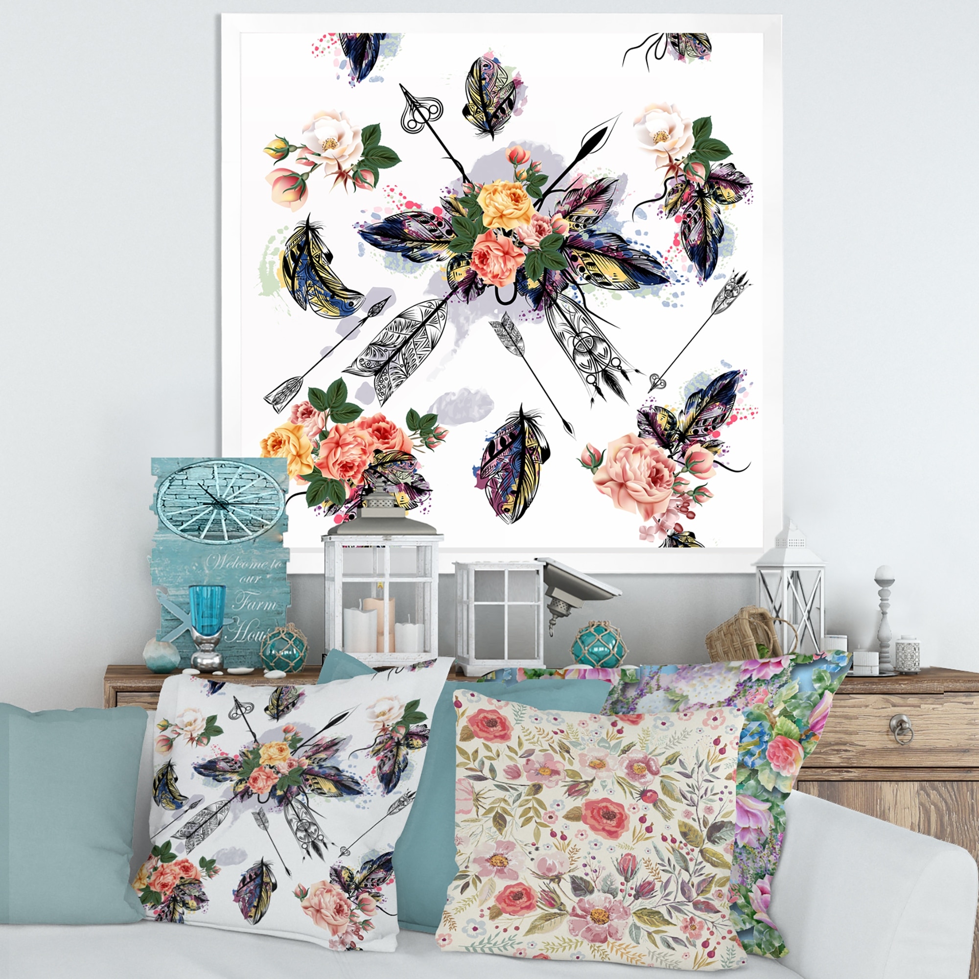 Designart "Ethnic Feathers and Flowers on Native Arrows III" Bohemian & Eclectic Framed Canvas Wall Art Print
