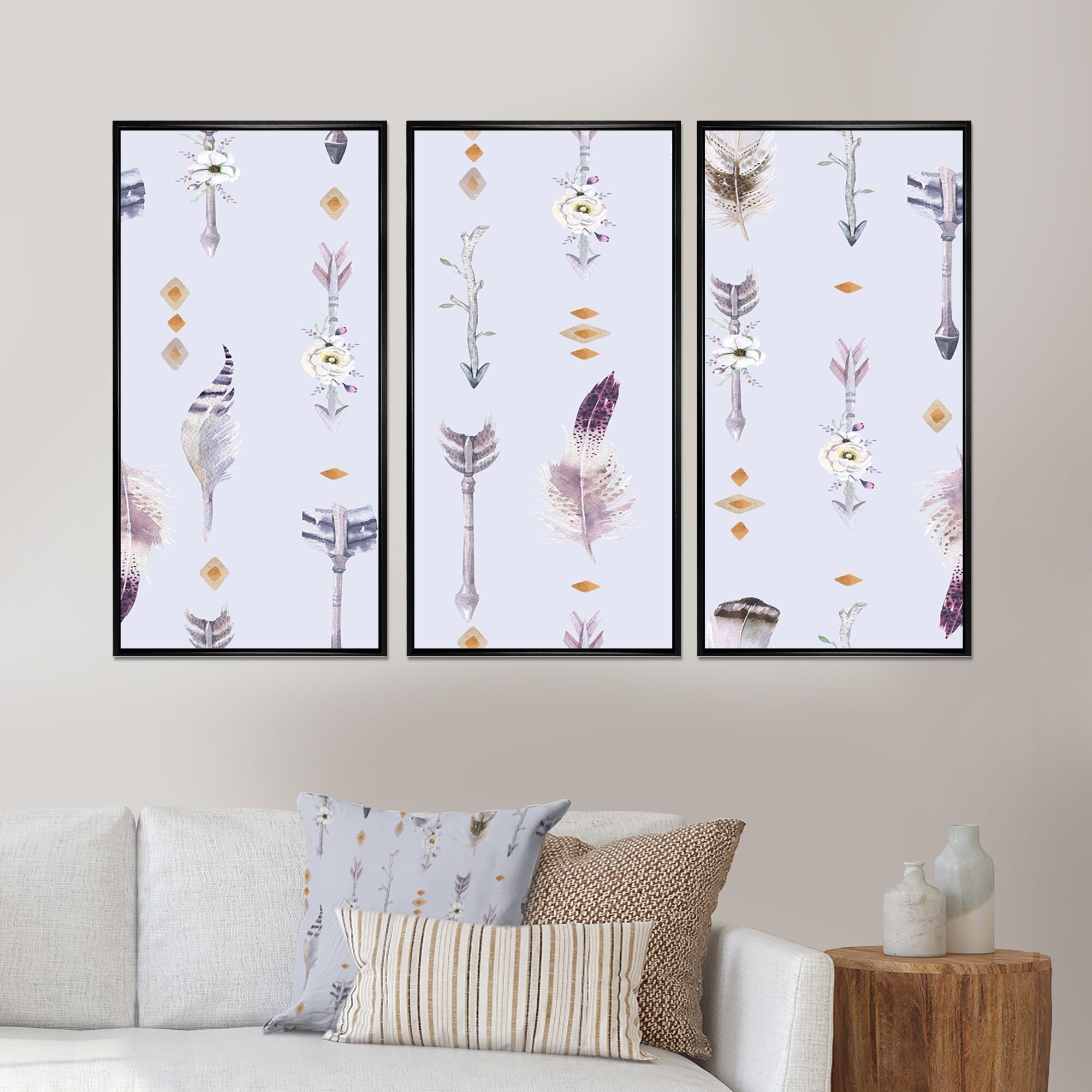 Designart "Boho Purple Arrows With White Flowers I" Bohemian Framed Artwork Set of 3 - 4 Colors of Frames