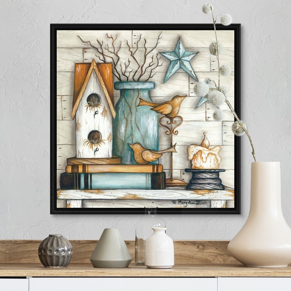 "Birdhouse on Books" Black Float Frame Canvas Art