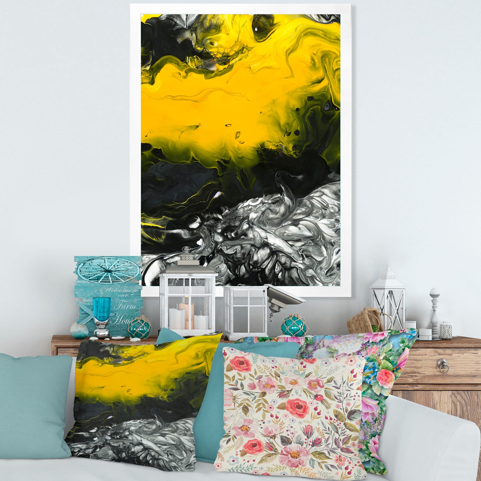 Designart "Yellow Black And White Liquid Art VIII" Modern Framed Art Print