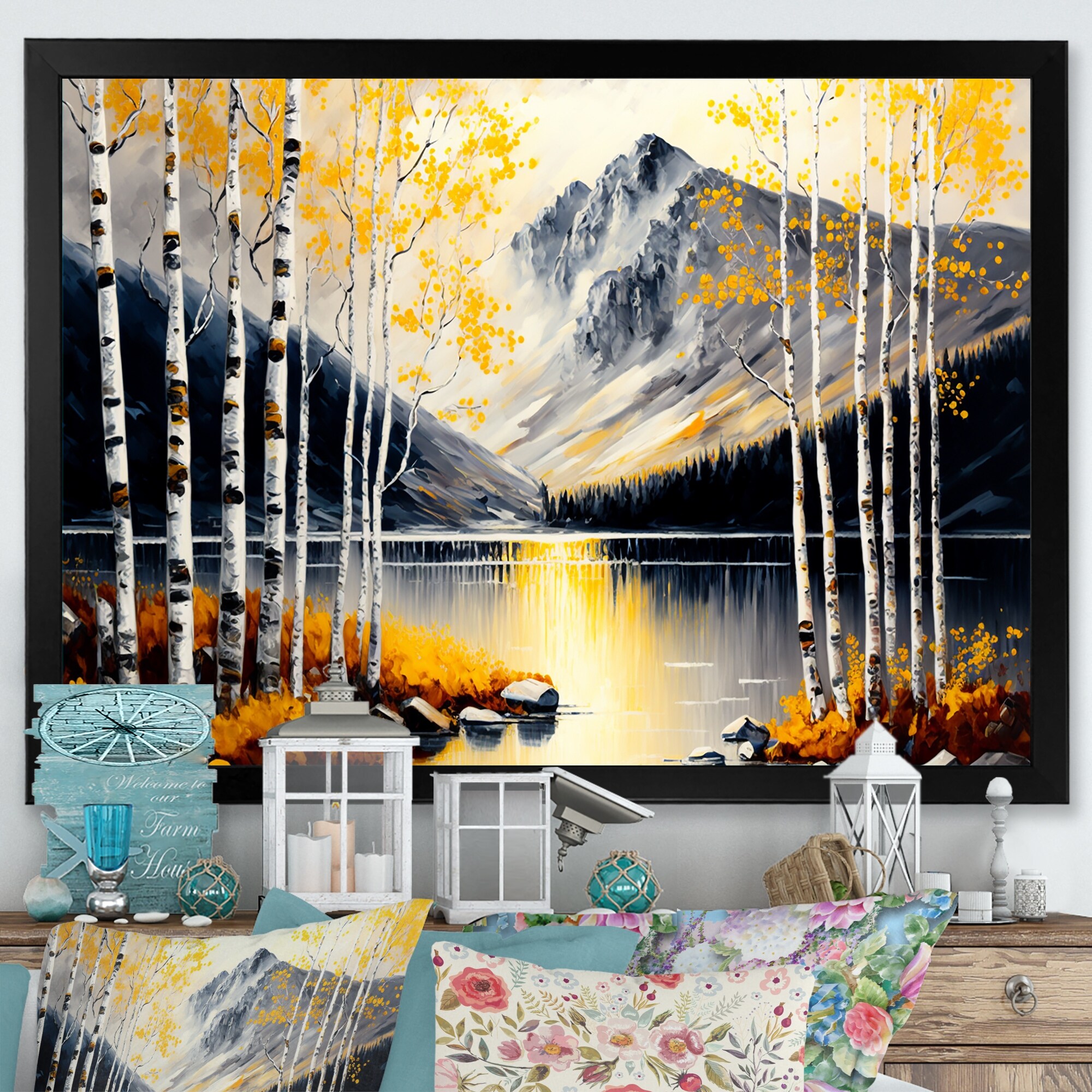 Designart "Monochrome Golden Birch Trees By the Lake II" Landscape Framed Art Print