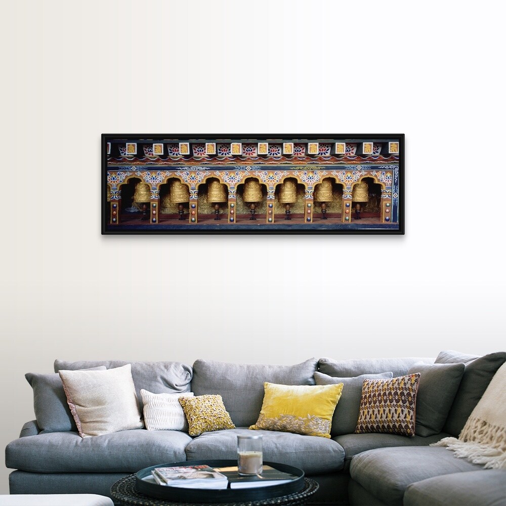 "Prayer wheels in a temple, Chimi Lhakhang, Punakha, Bhutan" Black Float Frame Canvas Art