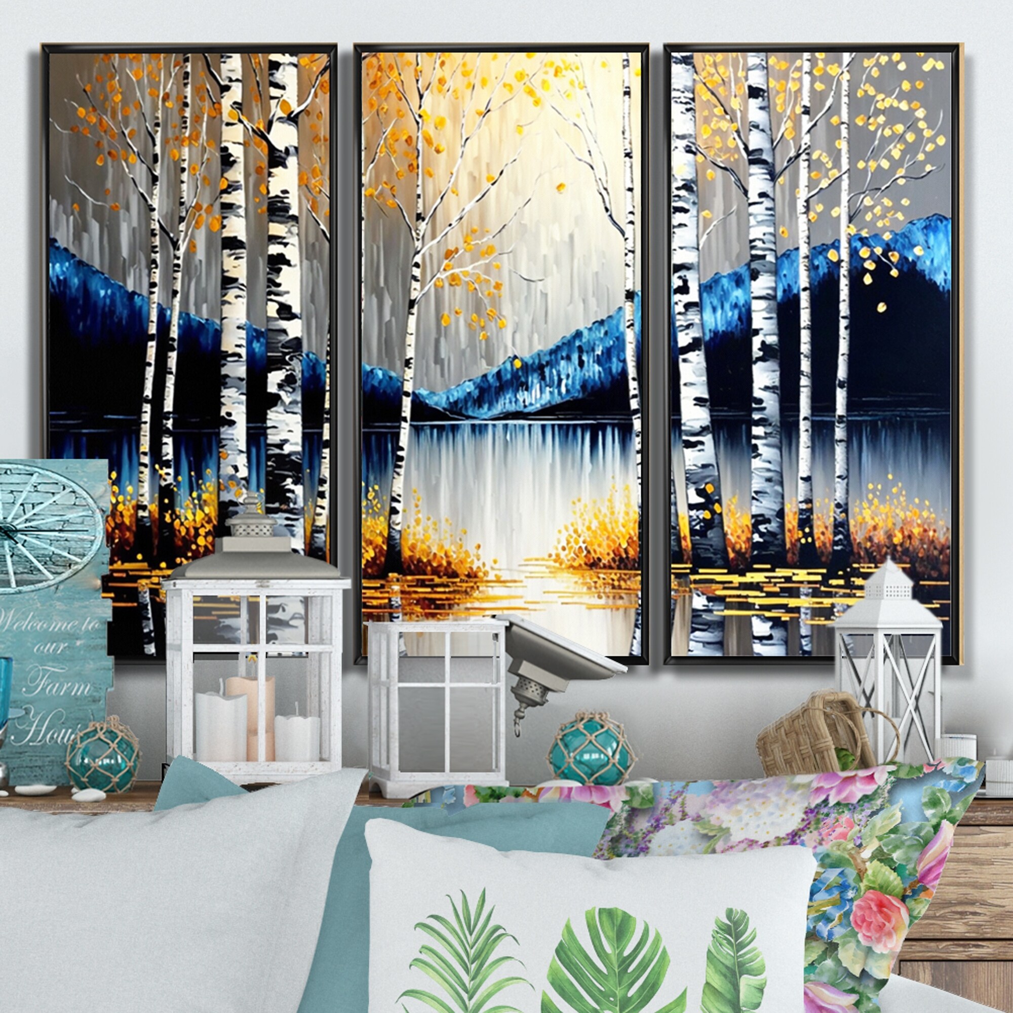 Designart "Monochrome Golden Birch Trees By the River II" Landscape River Forest Framed Canvas Art Print - 3 Panels
