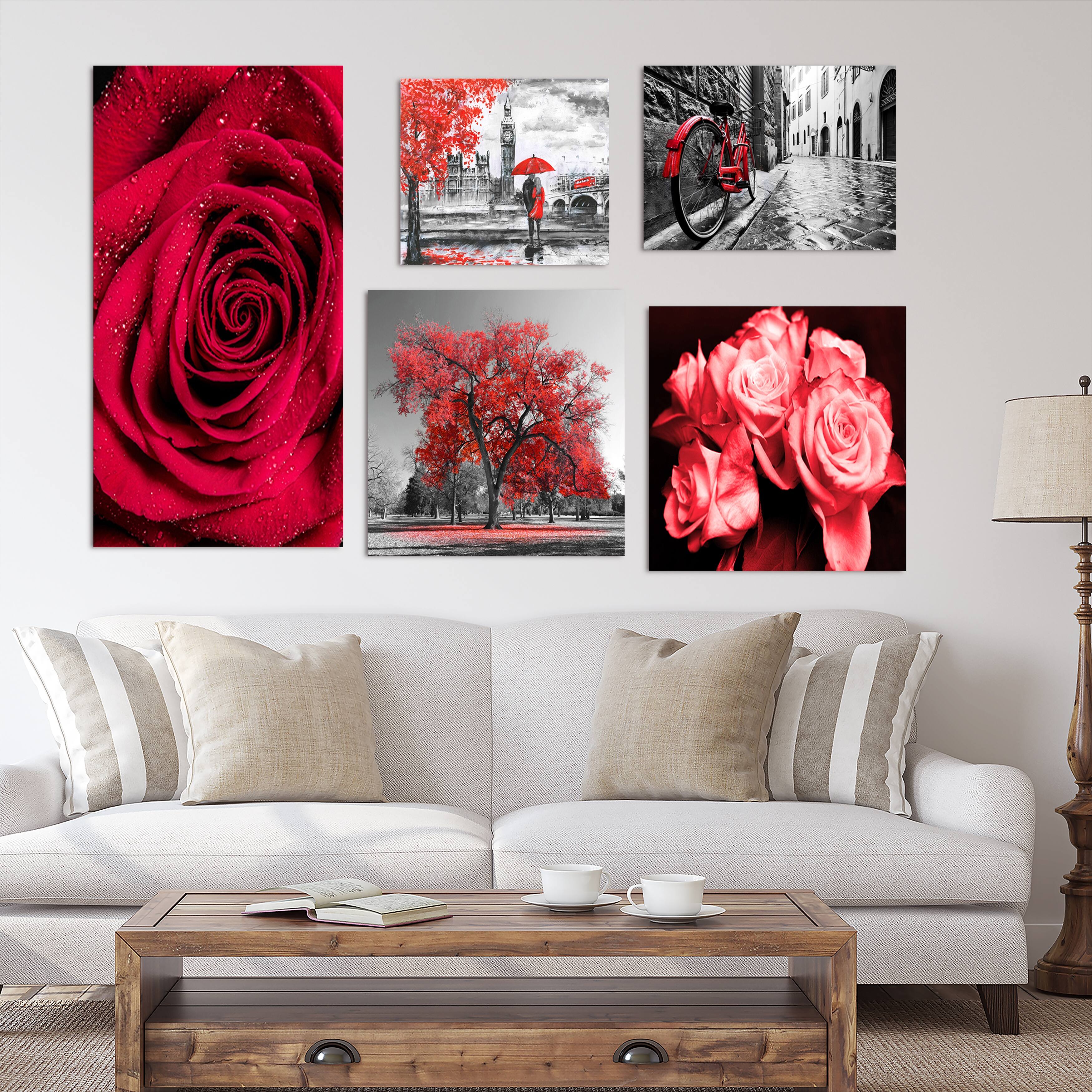 Designart - Rose Collection - Traditional Wall Art set of 5 pieces - Red