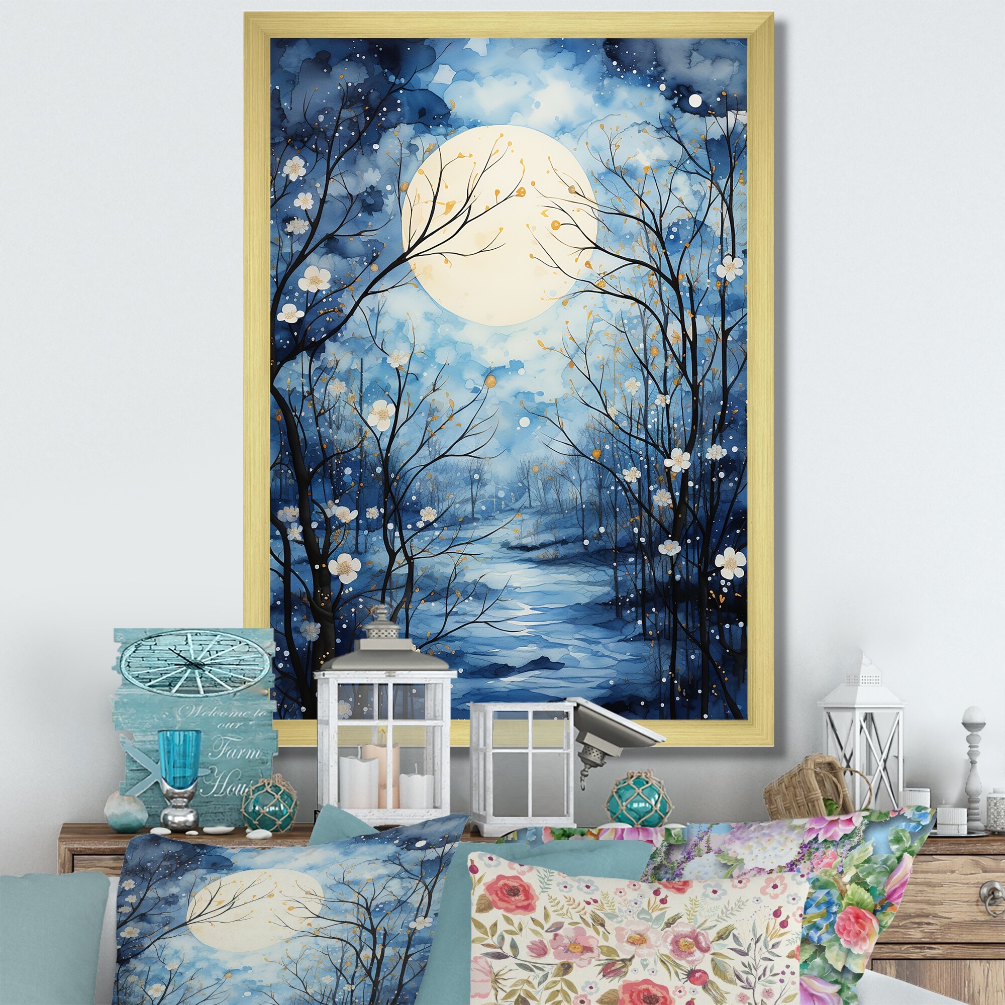 Designart "Blue White Tree Moonlit Silhouette I" Landscape Trees Framed Canvas Wall Art