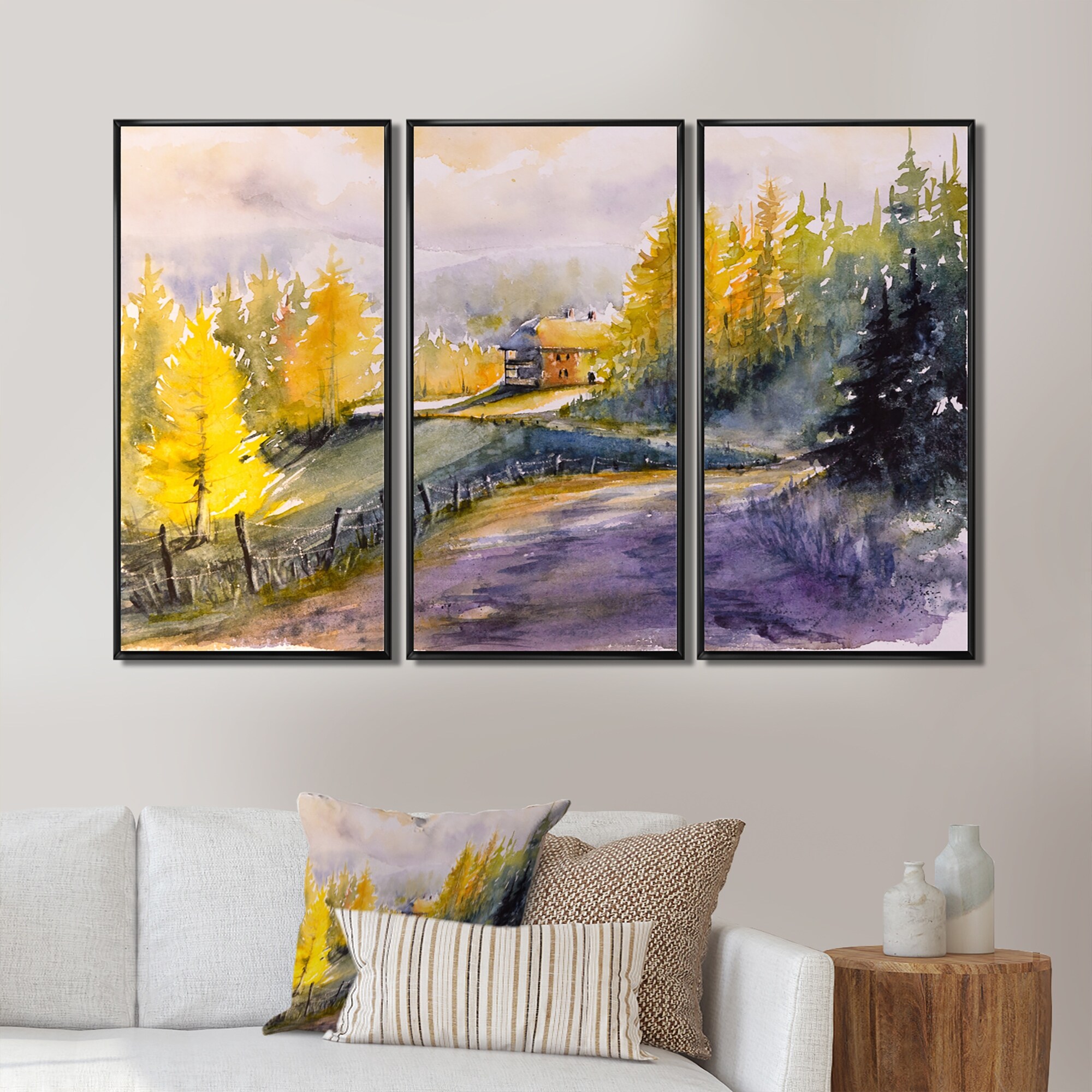 Designart "Landscape With Yellow Orange And Green Trees" Traditional Framed Artwork Set of 3 - 4 Colors of Frames